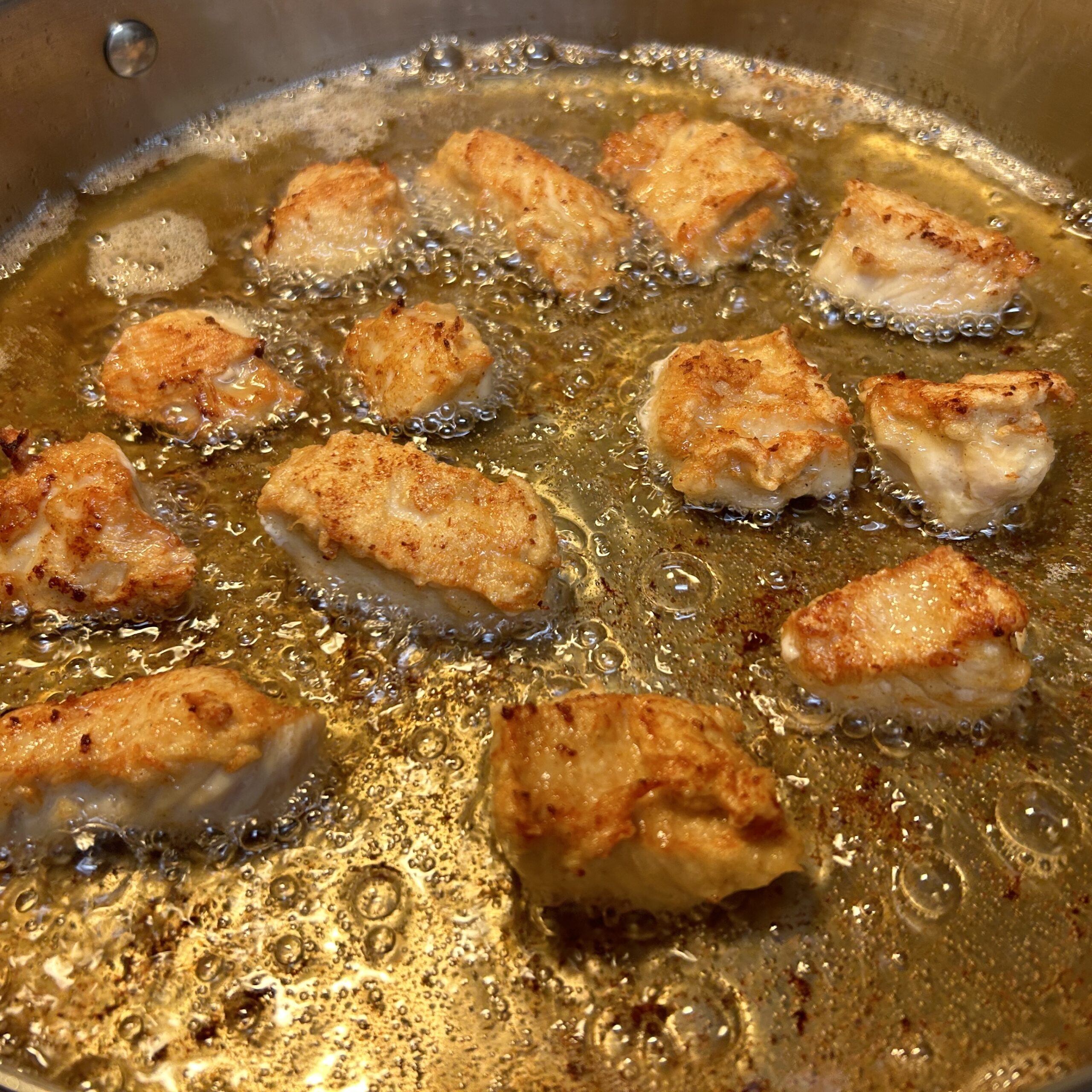 - When the oil is ready, cook the chicken in batches frying for about 4 minutes per side. Remove and drain.