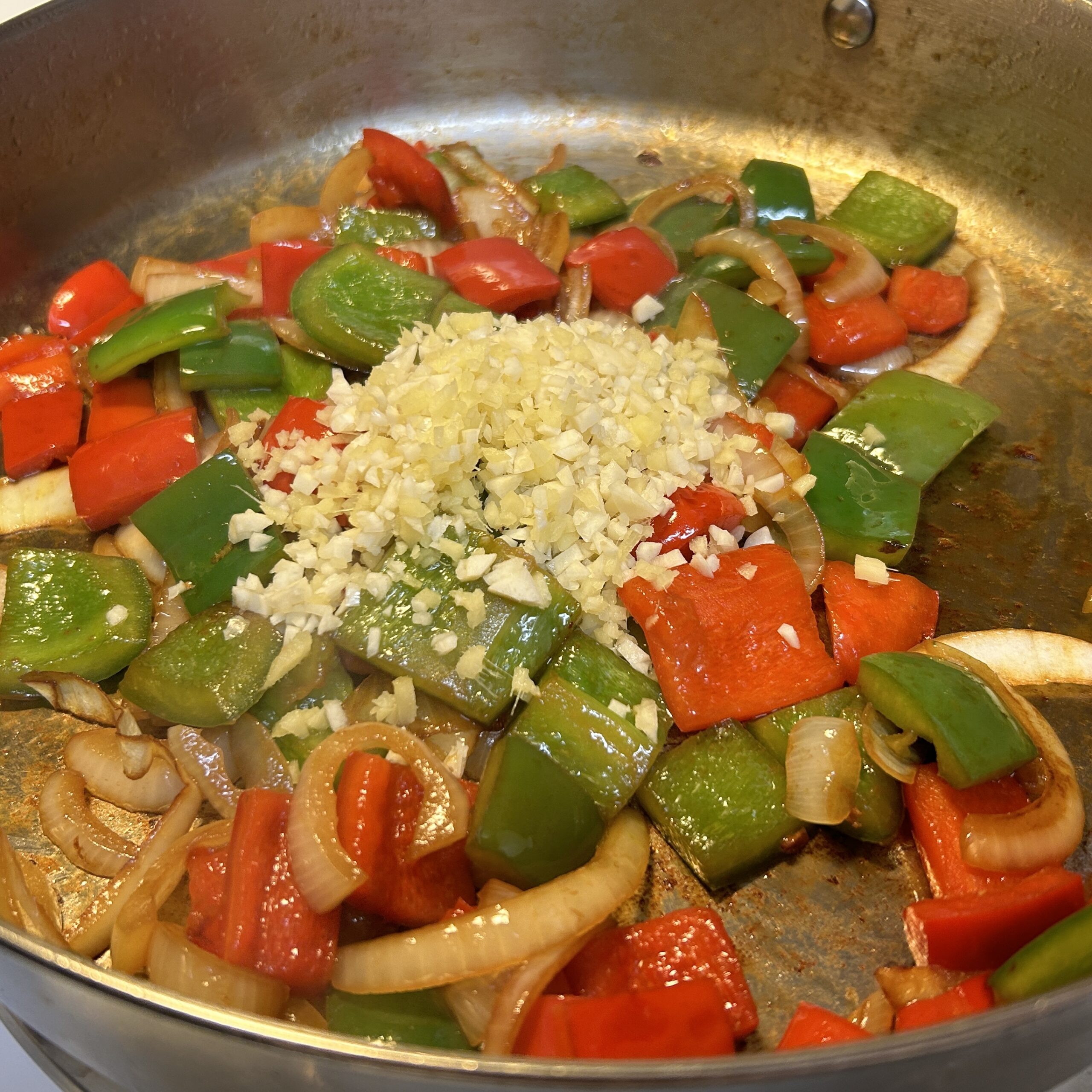 - When the oil is hot, add the red and green bell peppers along with the onions. Allow to cook for about 3-4 minutes or until softened.