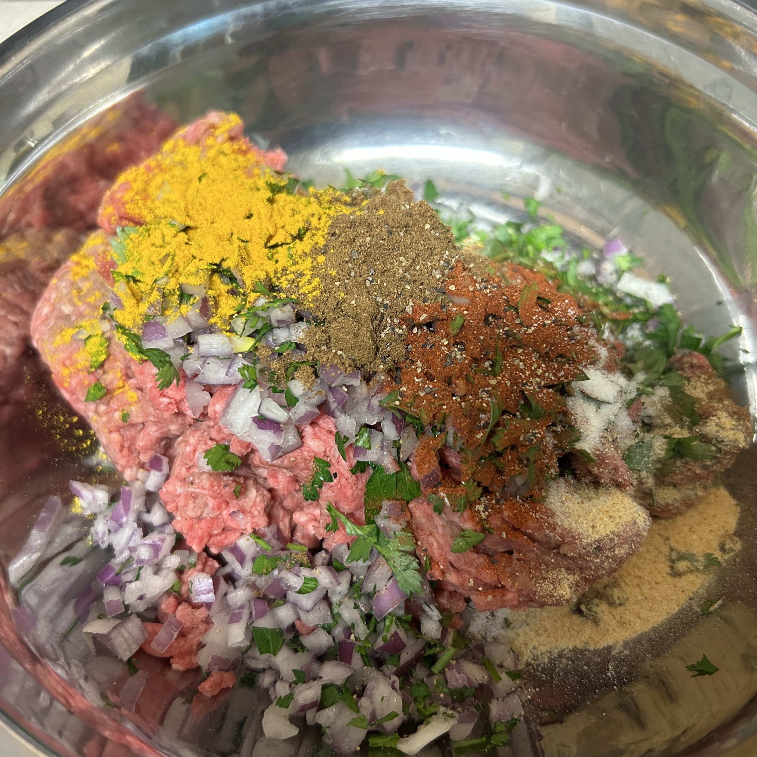 - In a bowl, combine the onion, ground meat, spices and herbs. Mix thoroughly, kneading together for about 2 minutes.