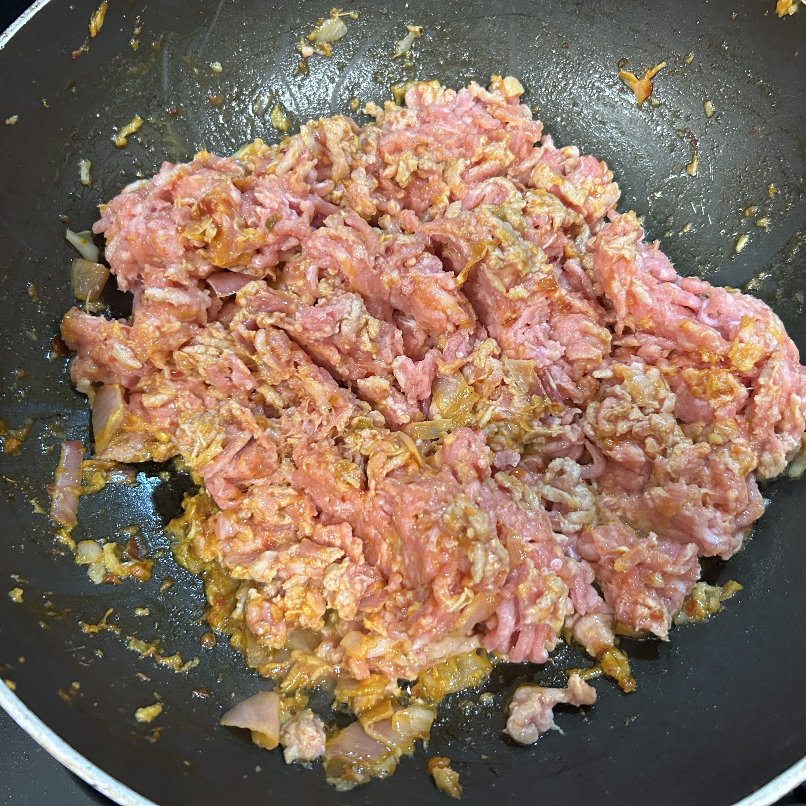 - Add the pork and incorporate with paste.