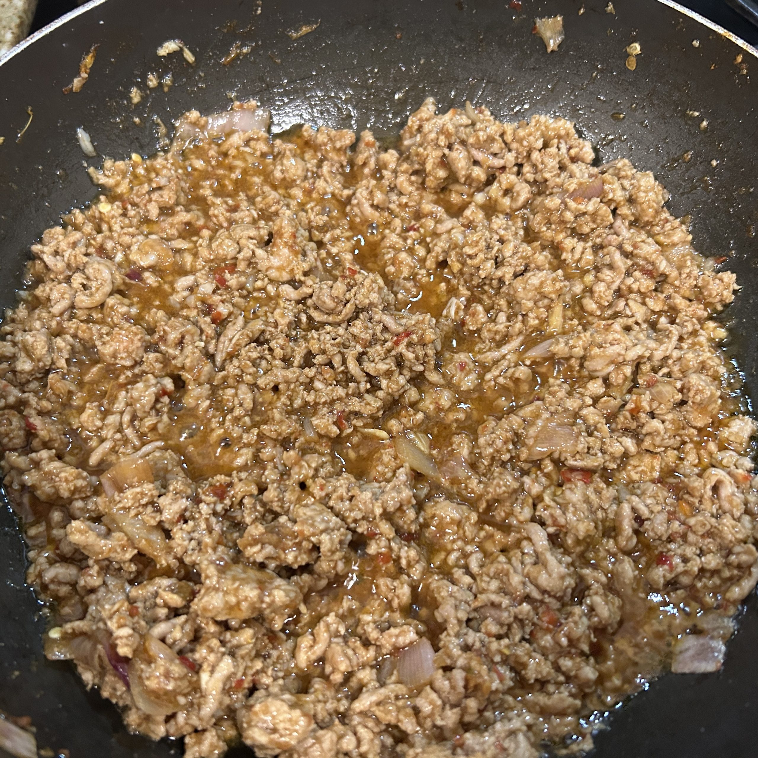 - Continuing stirring until the pork is fully cooked and brown.