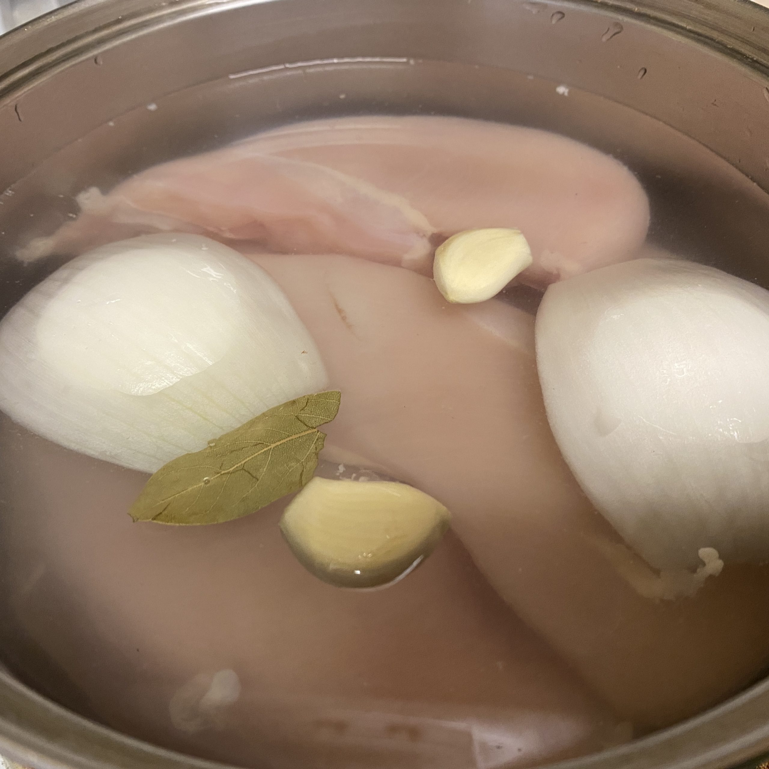 - In a medium pot, add water, chicken, half an onion, 2 garlic cloves and 1 bay leaf. Season generously with salt.