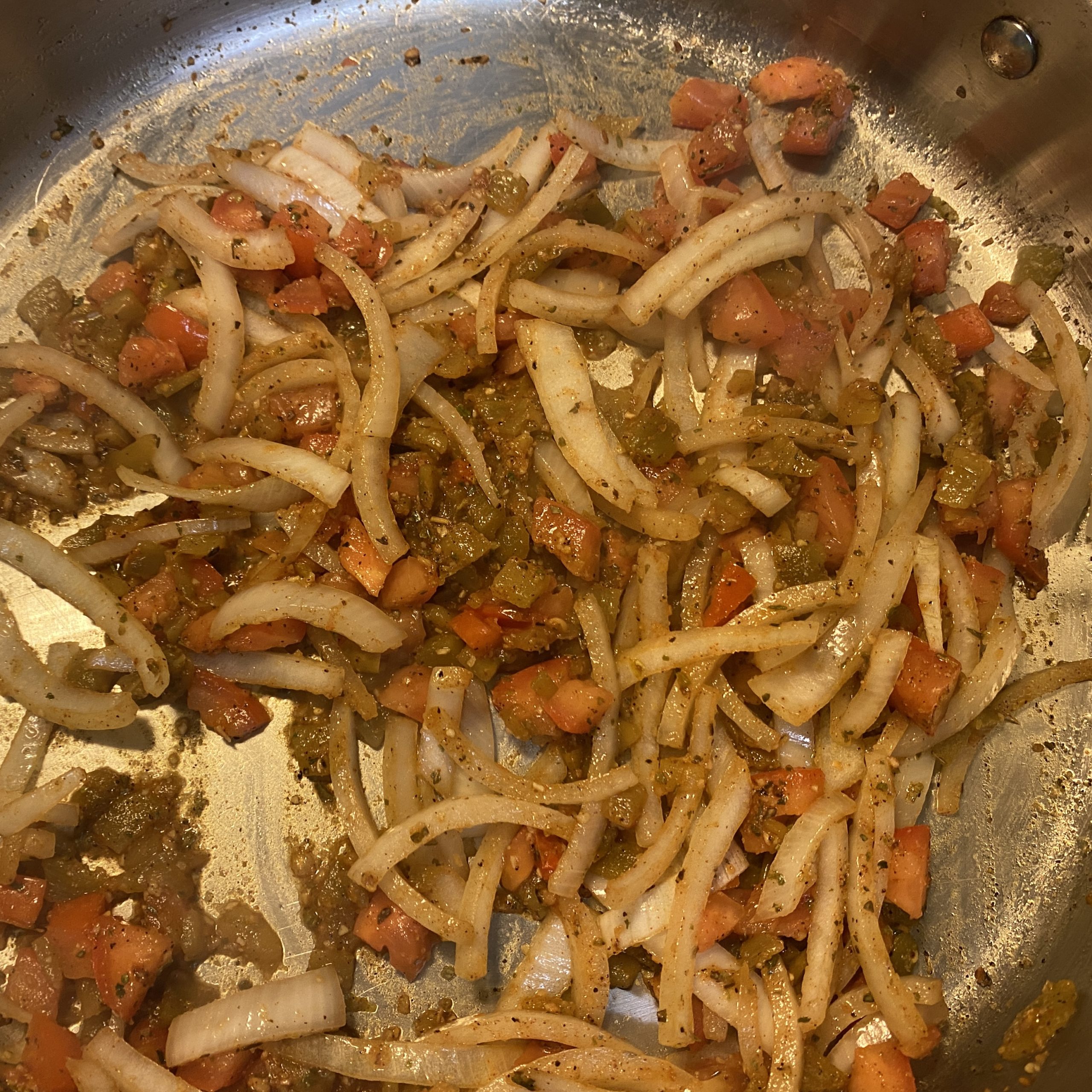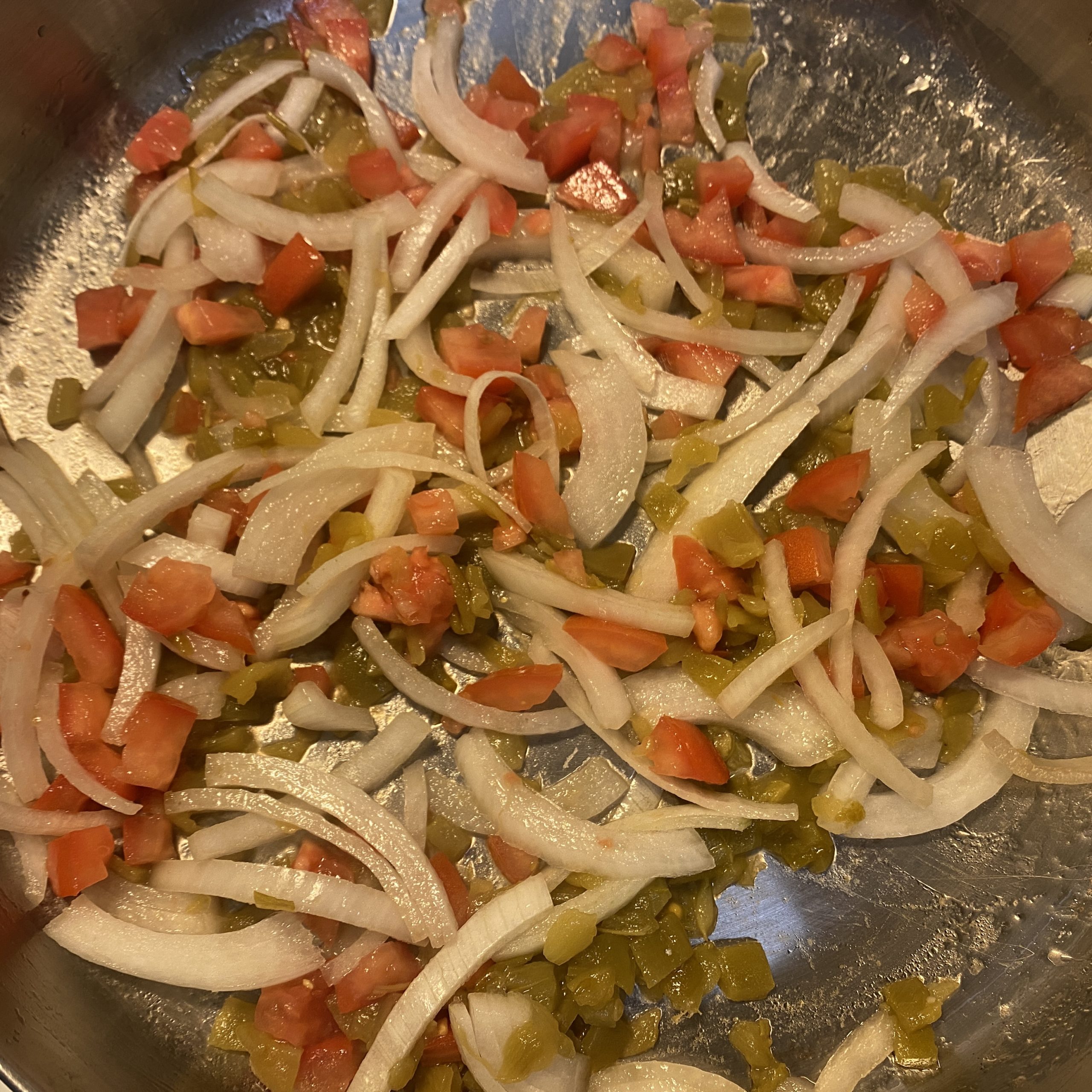 - In a large pan over medium heat, add one tablespoon of oil or enough to just coat the pan. Add the onions, tomatoes and green chiles (make sure to drain the chiles before adding it to the pan). Sauté until soft. Add the garlic and sauté for a minute or until fragrant.