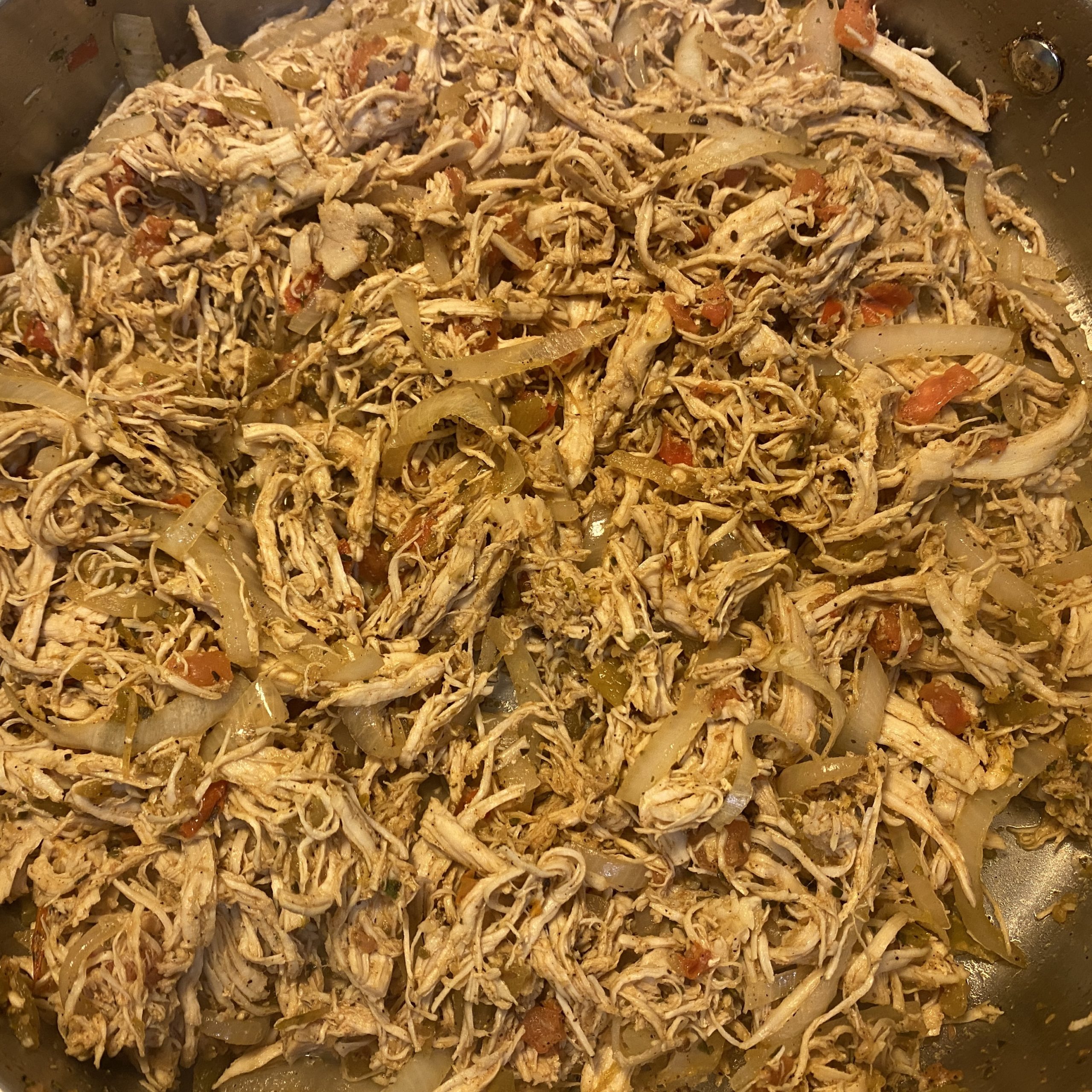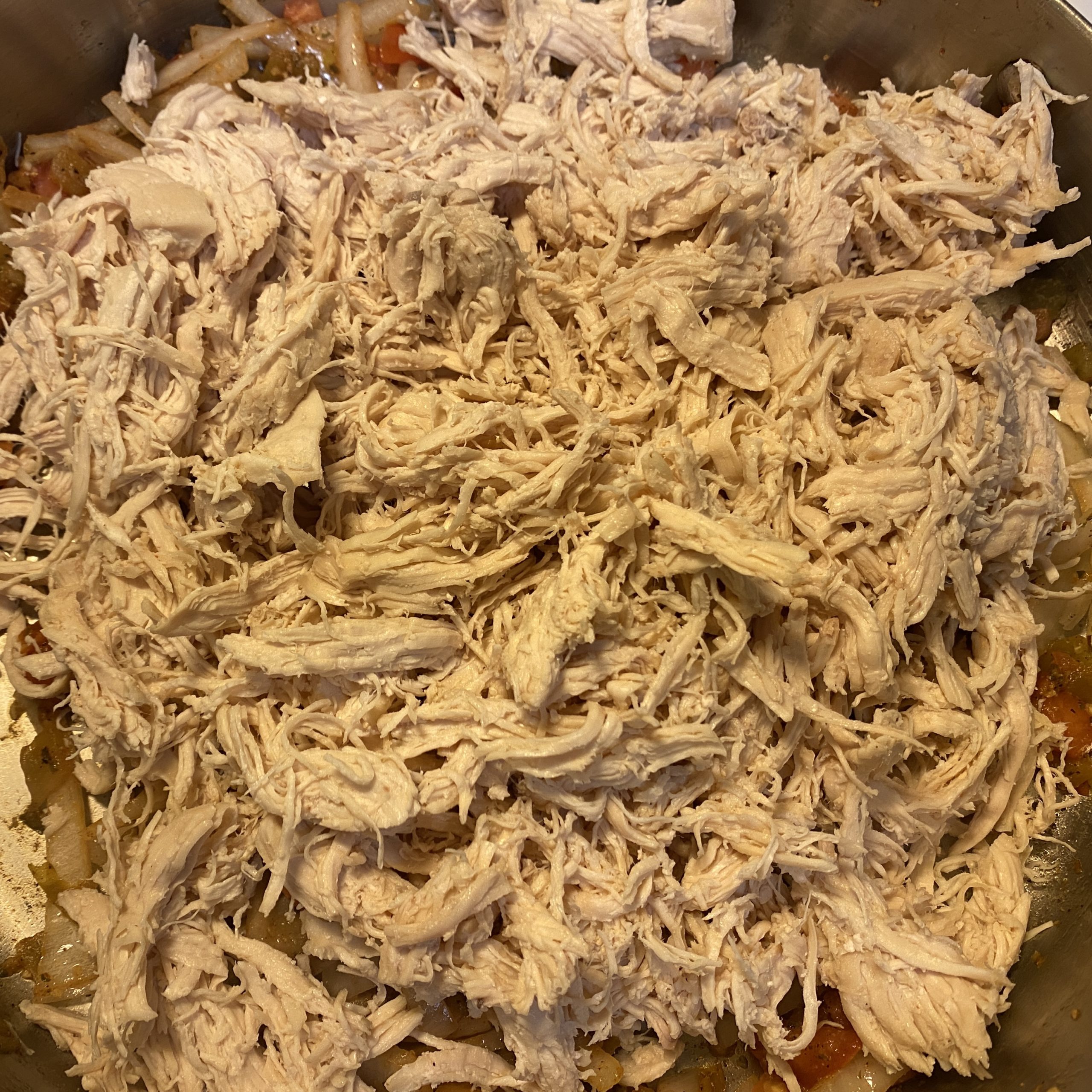 - Add the shredded chicken and mix thoroughly. Taste and adjust seasonings to your liking.