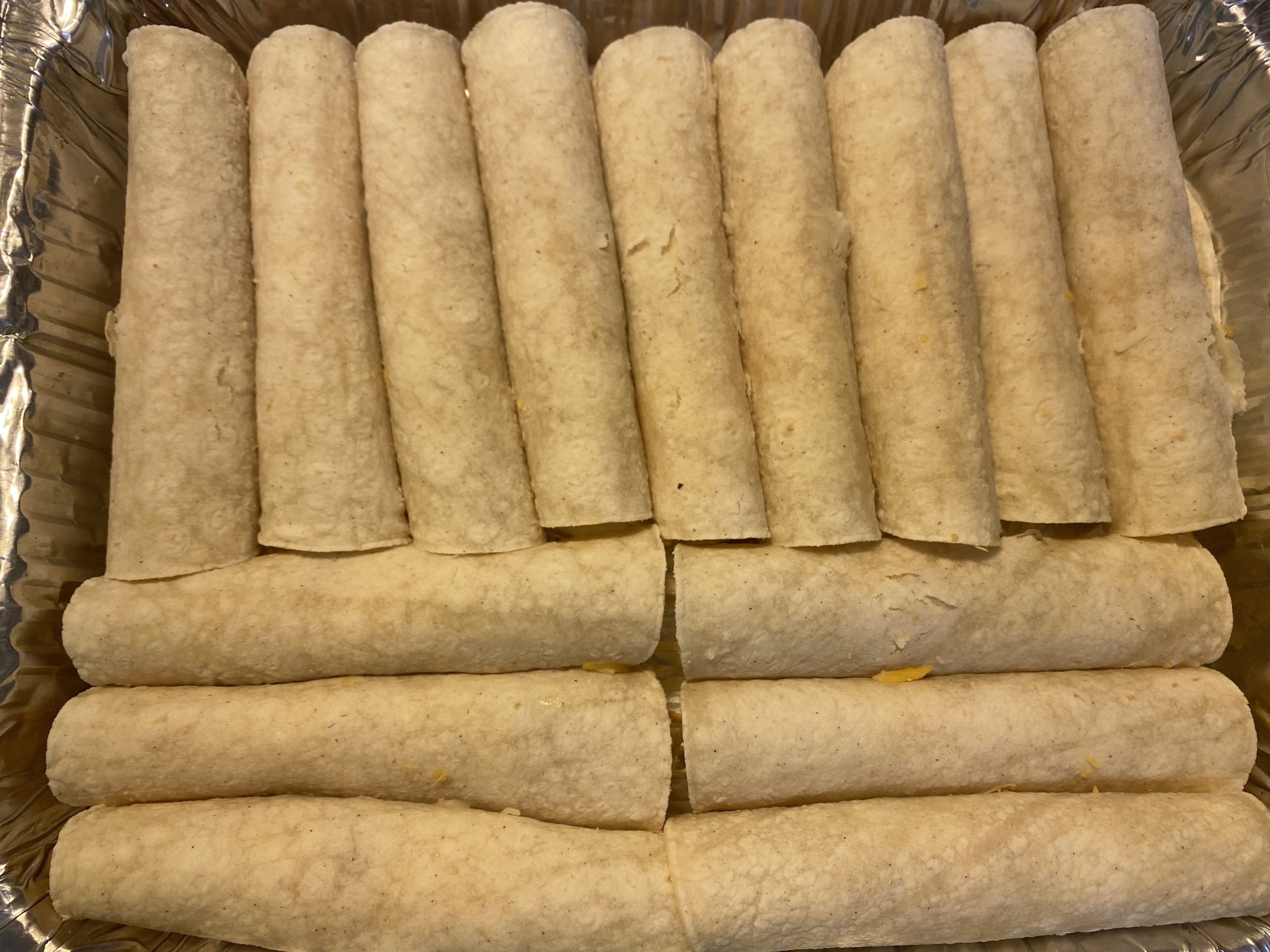 - Take a good amount of the chicken and add it to the base of the tortilla. Add cheese and roll from the bottom up. Set aside and repeat with remaining tortillas.
