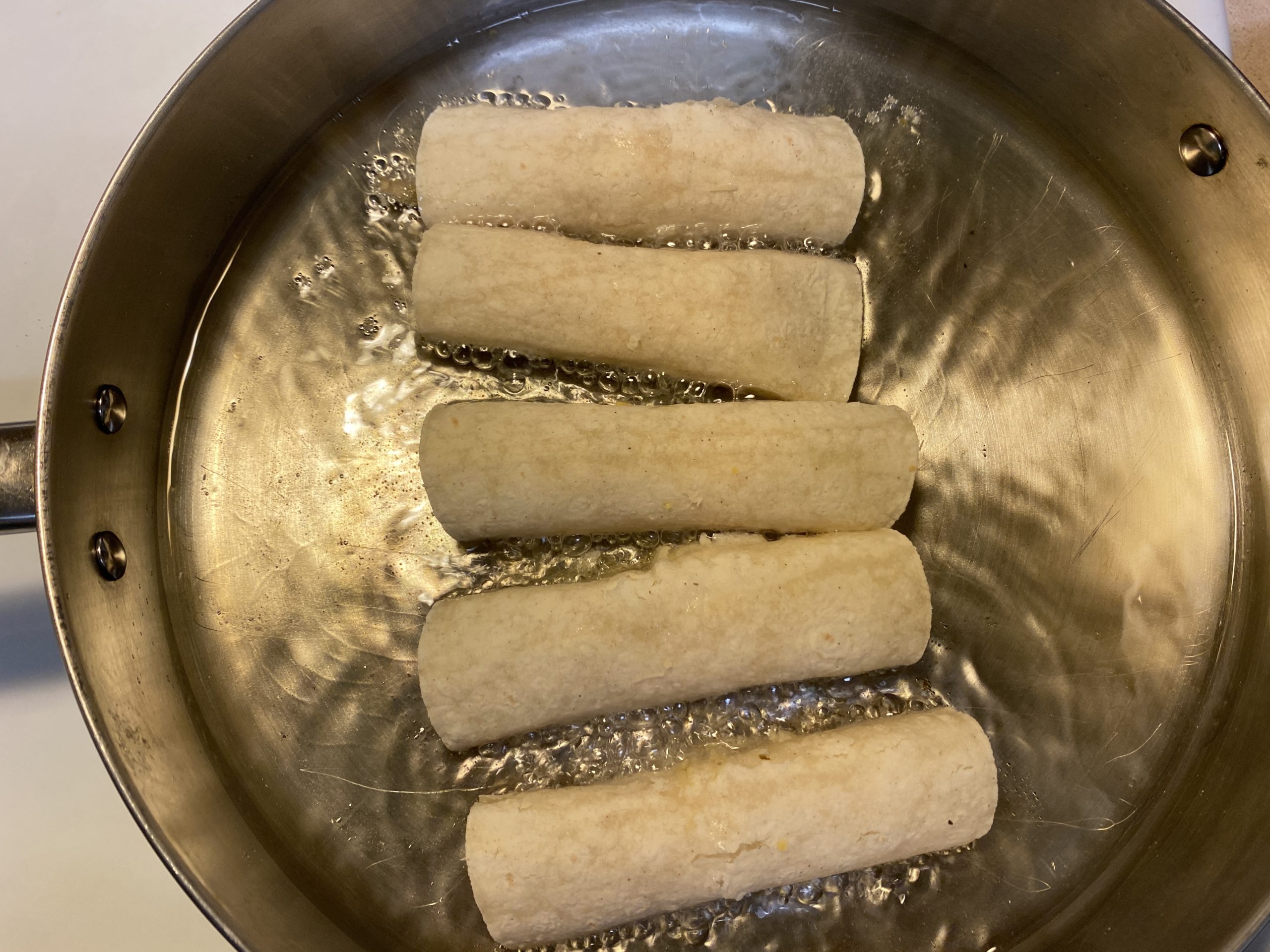 - In a large saucepan add about an inch of oil, enough to submerge the flautas halfway. Set to medium heat.