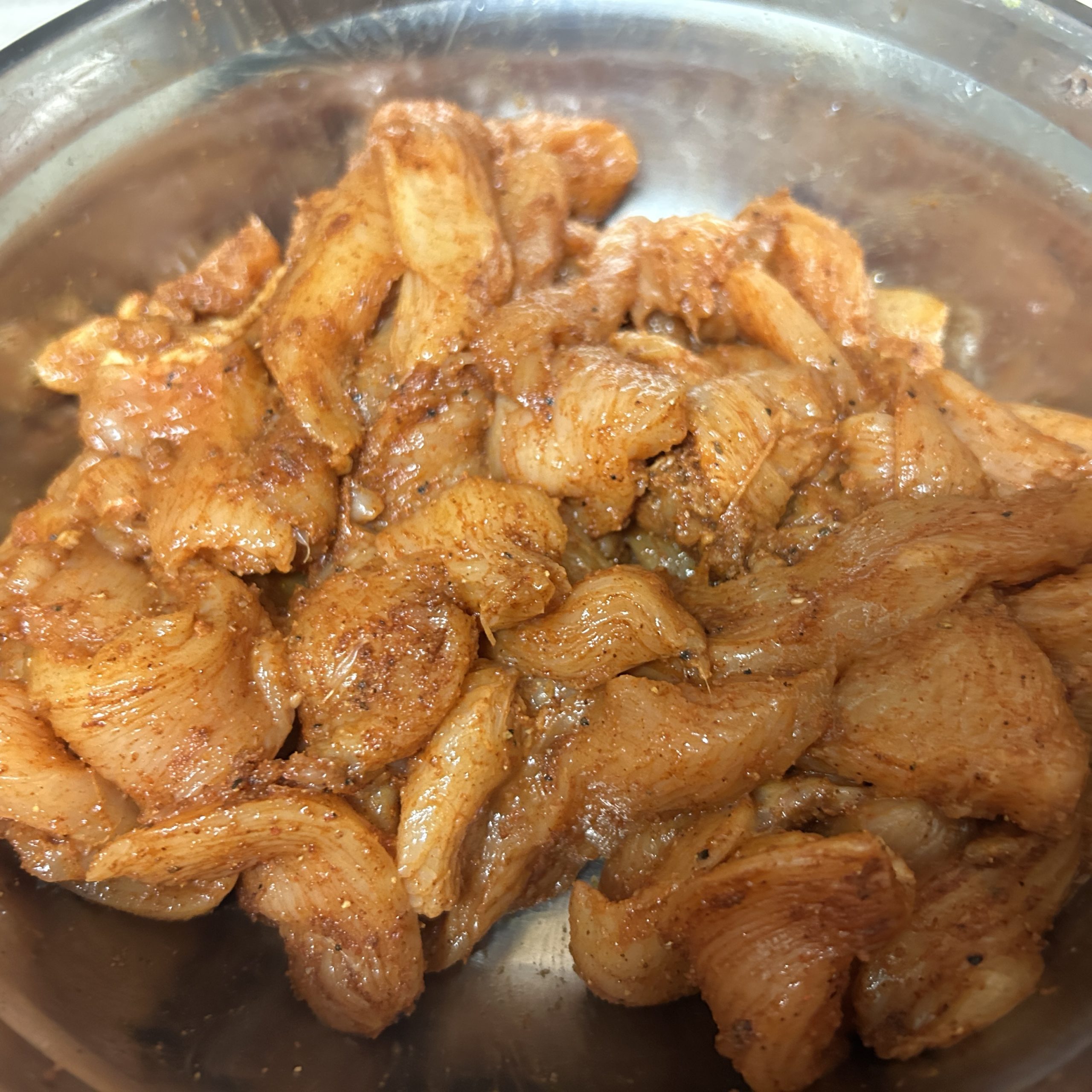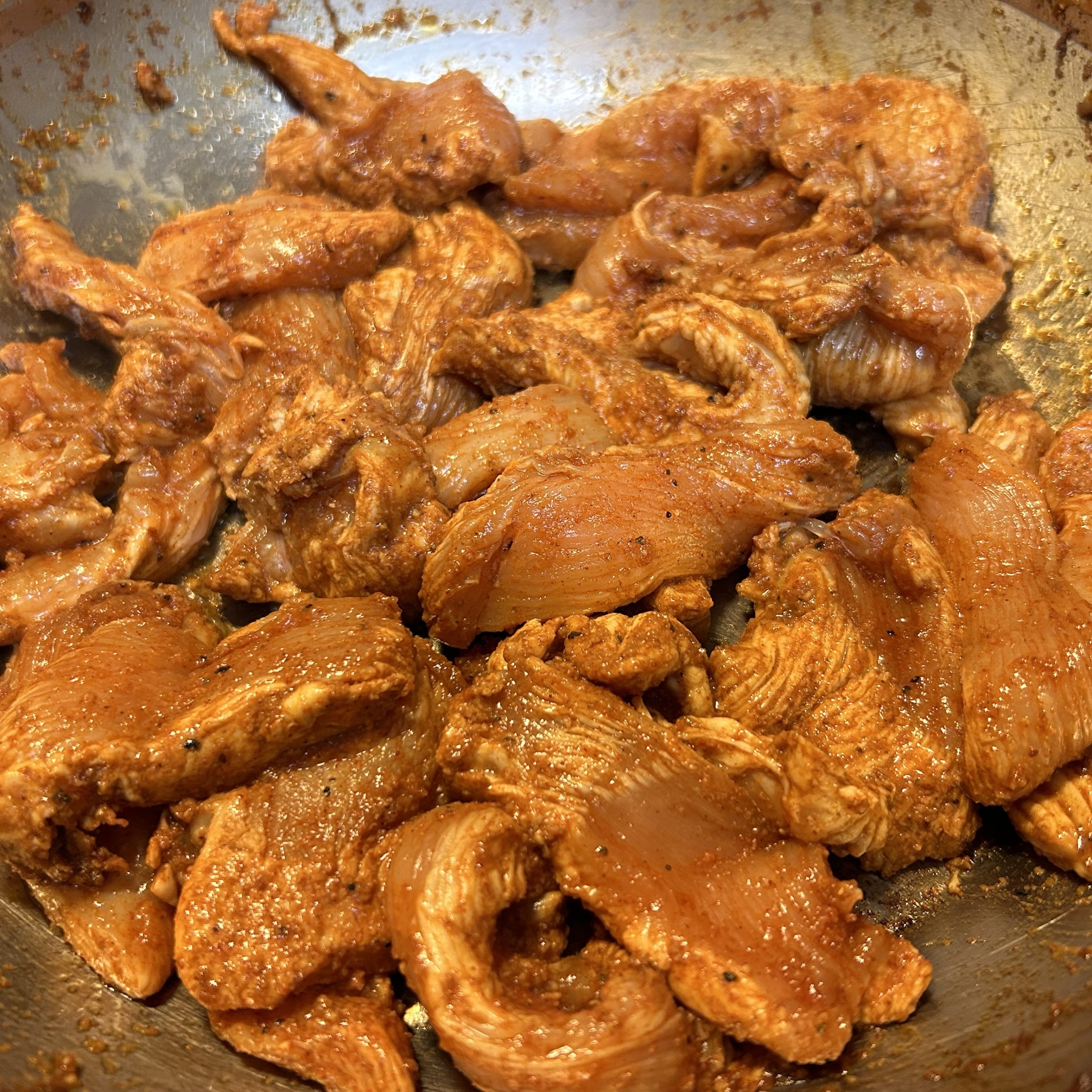 1. Start by cutting the chicken into strips. Transfer to a bowl.