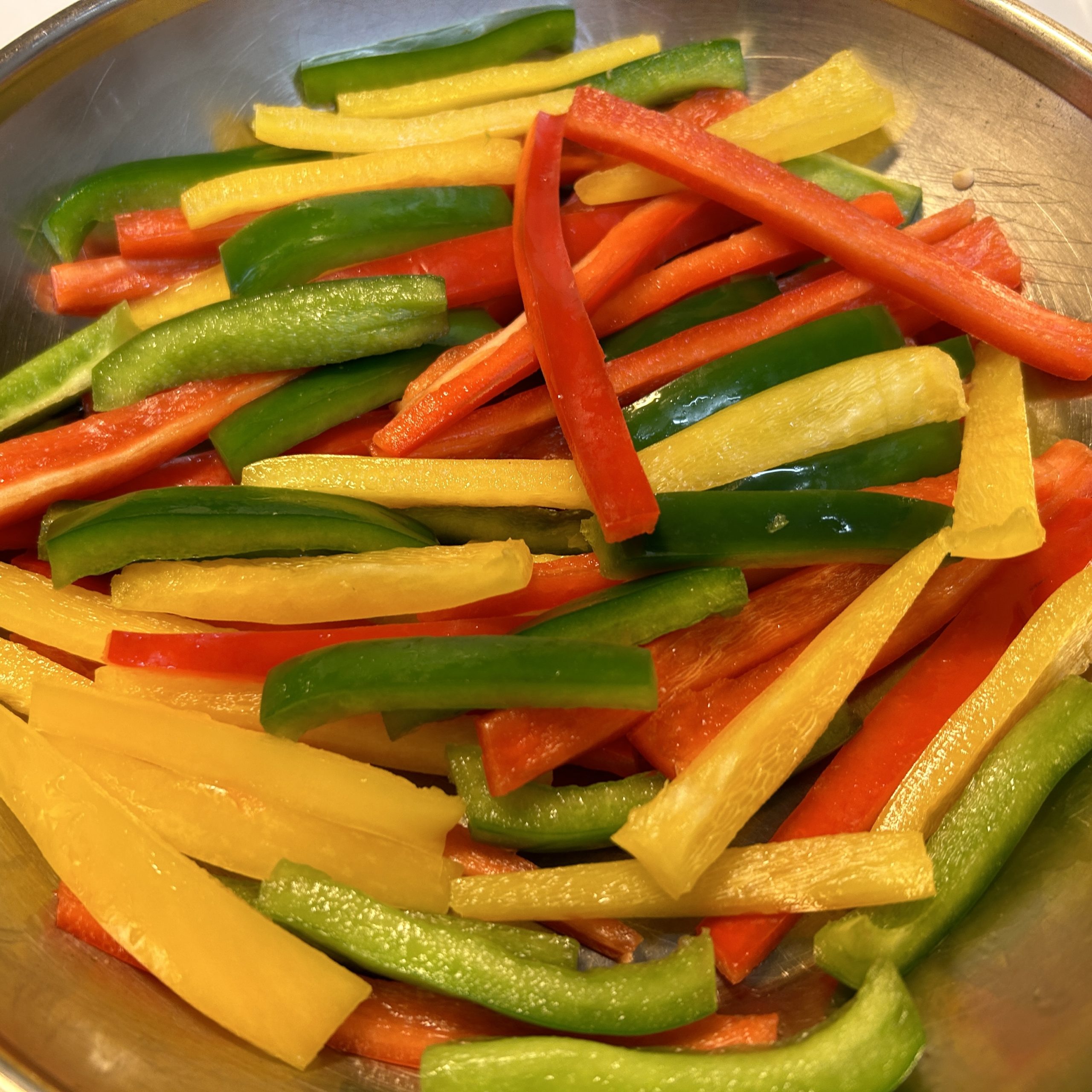 3. Now it’s time to get started on your vegetables! Thinly slice all the bell peppers and onion.