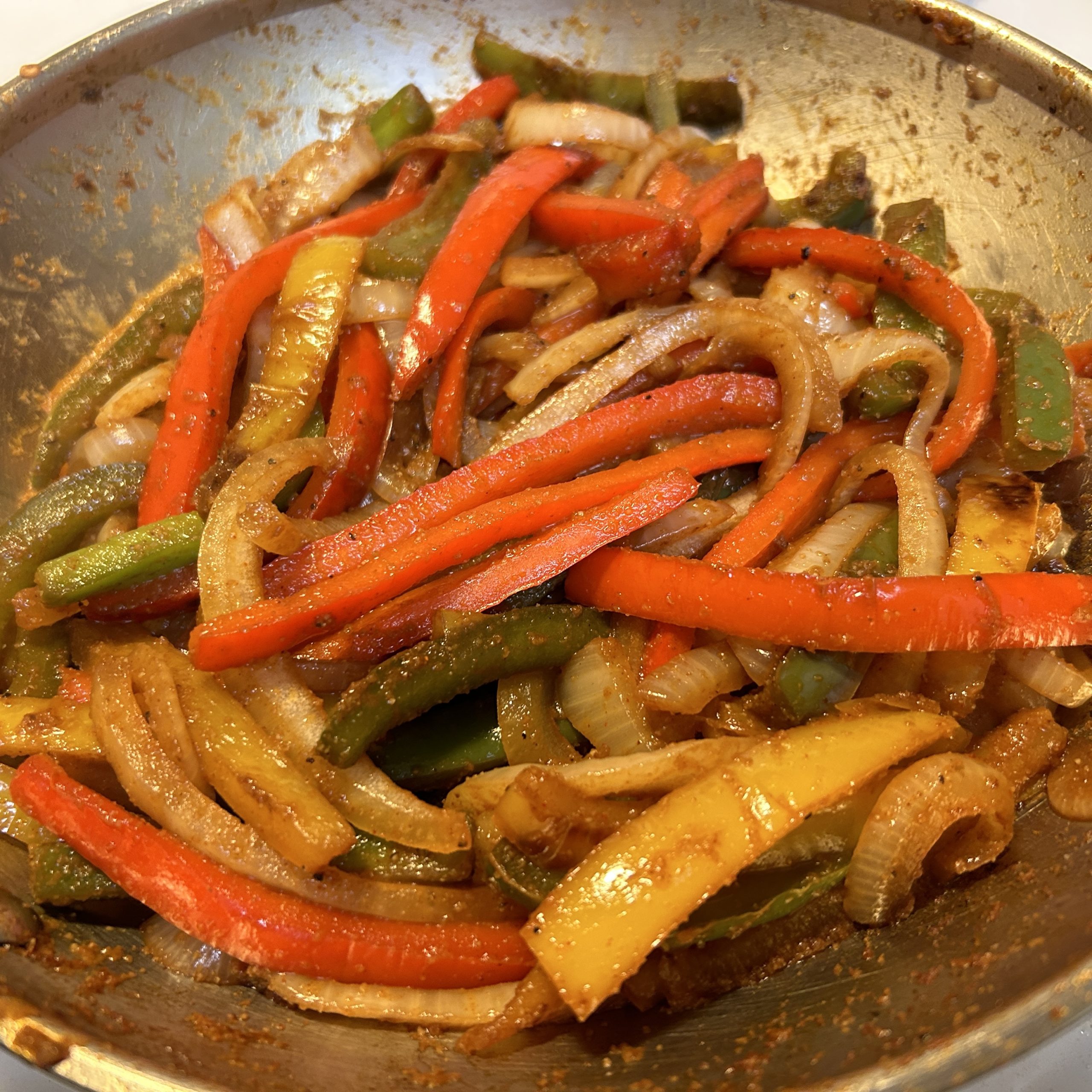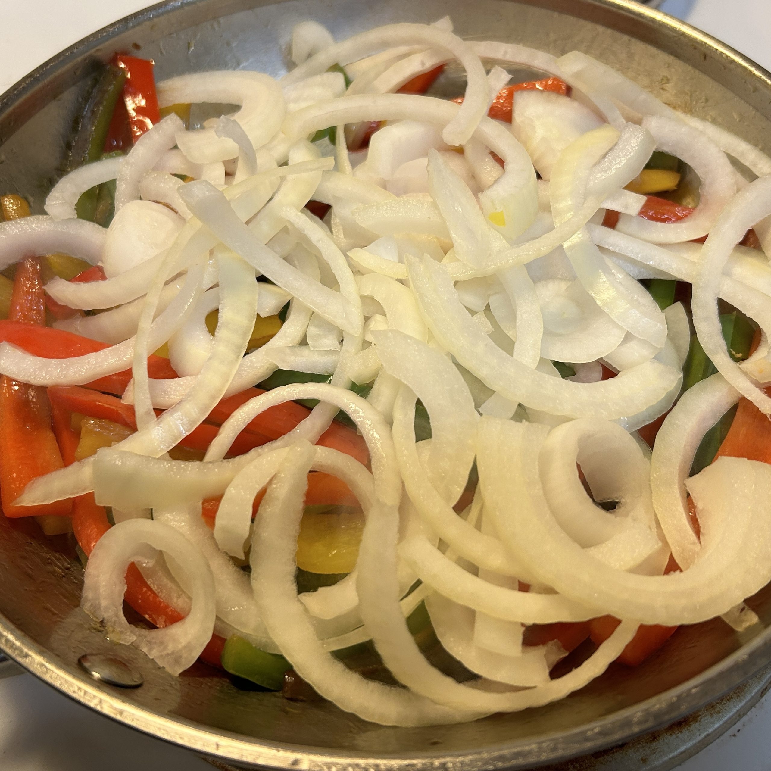 5. Add the peppers and sautee until softened, about 2-3 minutes. Add the onions and continue to sautee until all the vegetables are cooked through, about 2-3 minutes. (Optionally, you can season with the same seasoning mixture used on the chicken for some added flavor!)