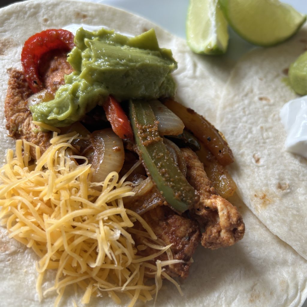 - Assemble the fajita with the chicken, vegetables and your favorite toppings.