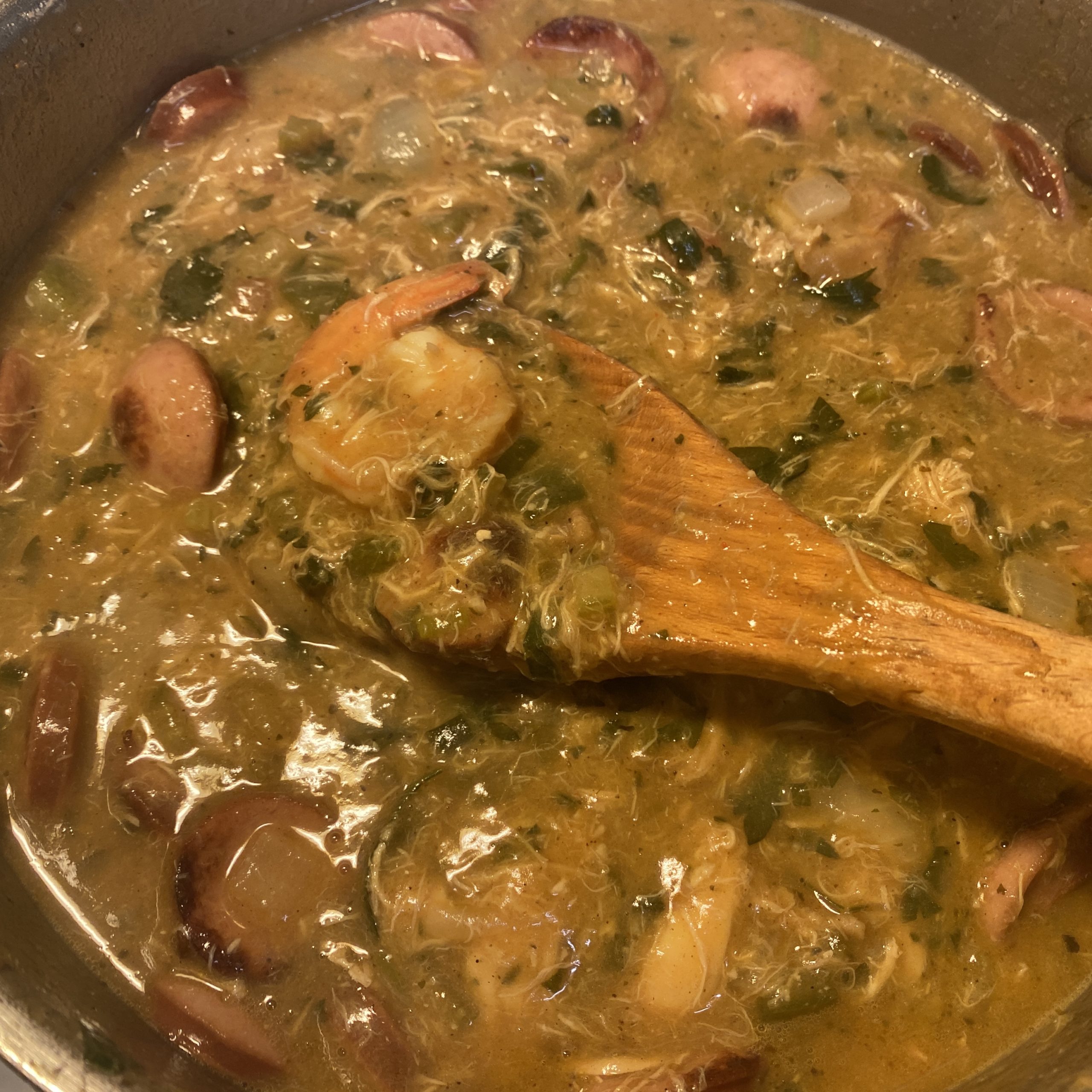 It consists of a dark roux made from oil or butter and flour, cooked low and slow to add a rich flavor and dark color to the gumbo’s stock.