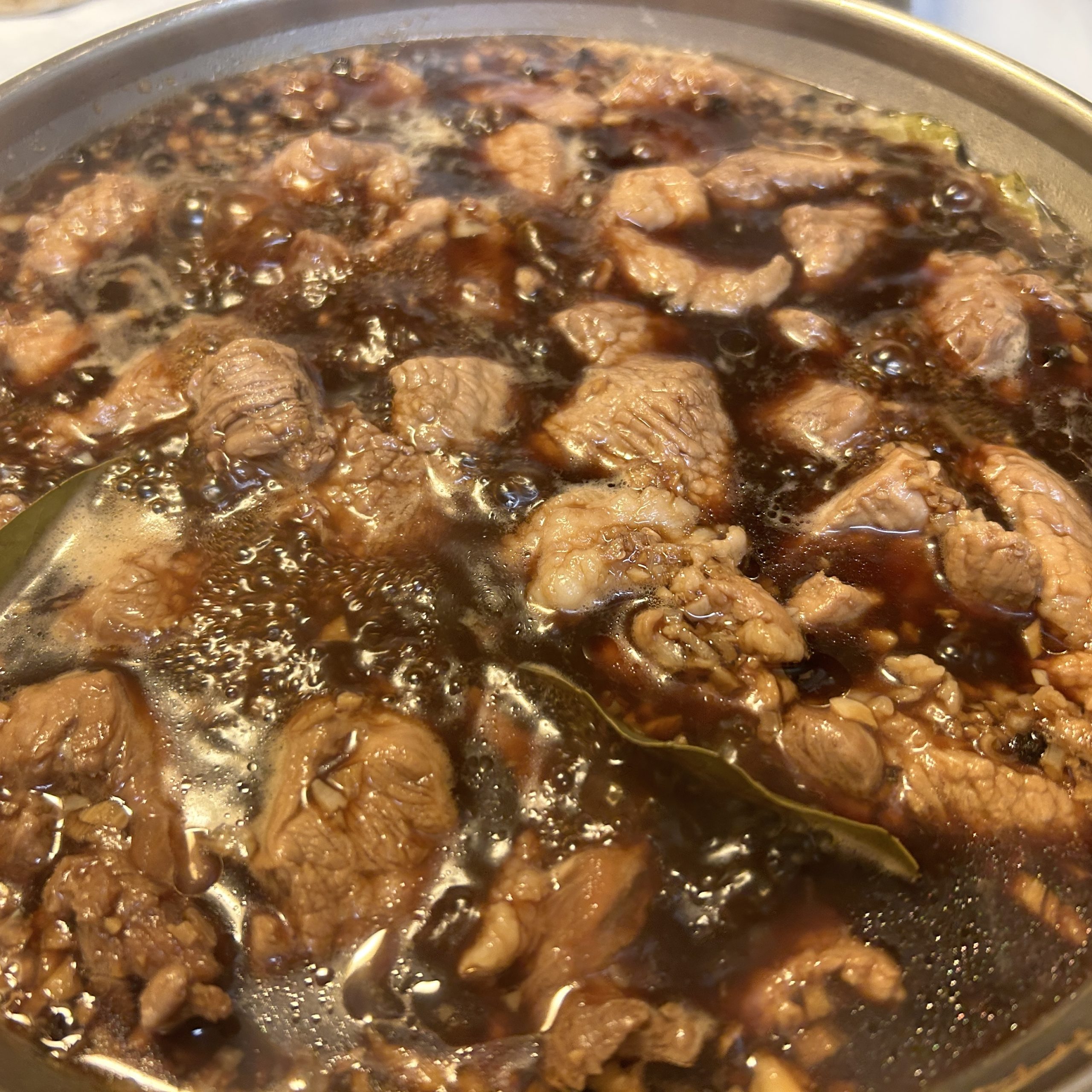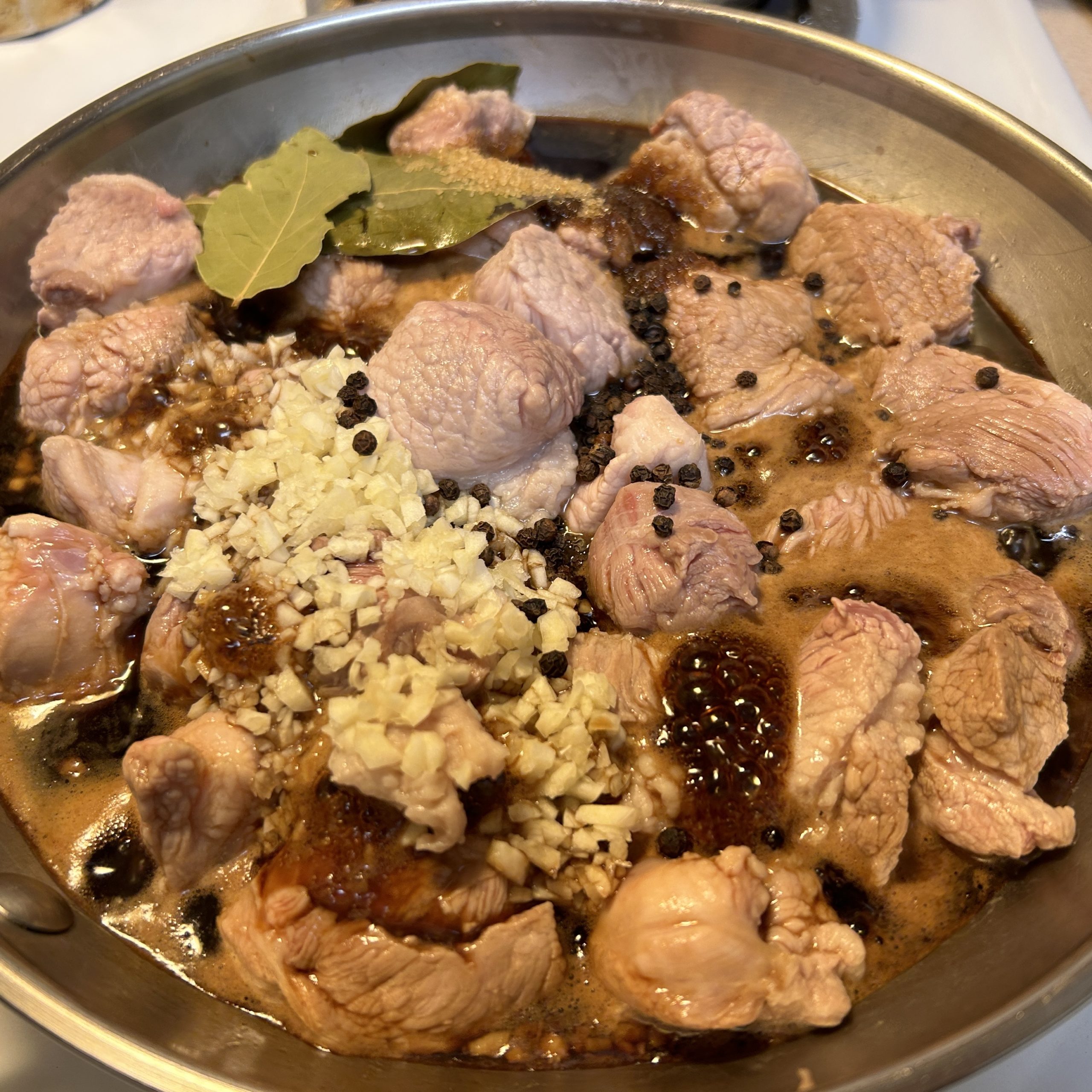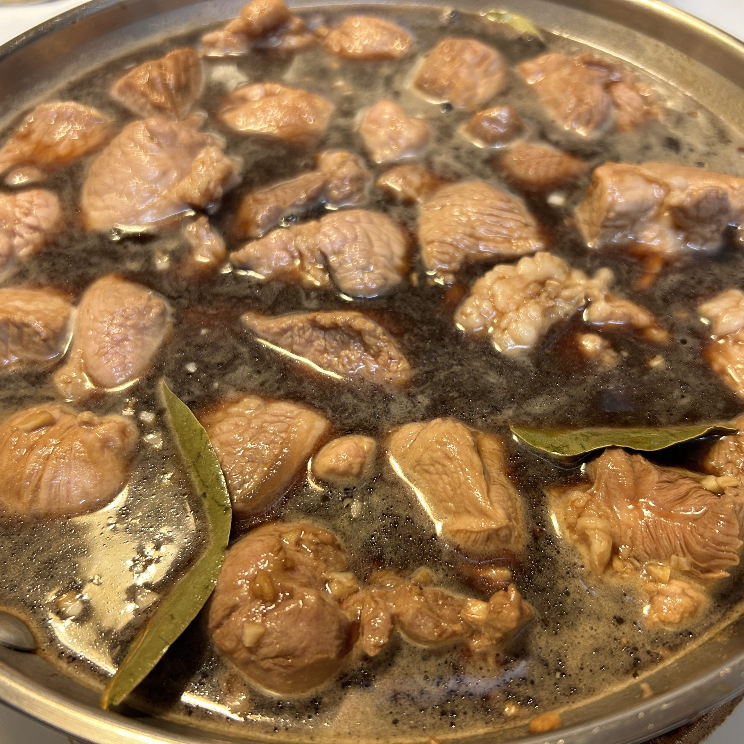 3. Add the soy sauce, vinegar and enough water to cover the pork.