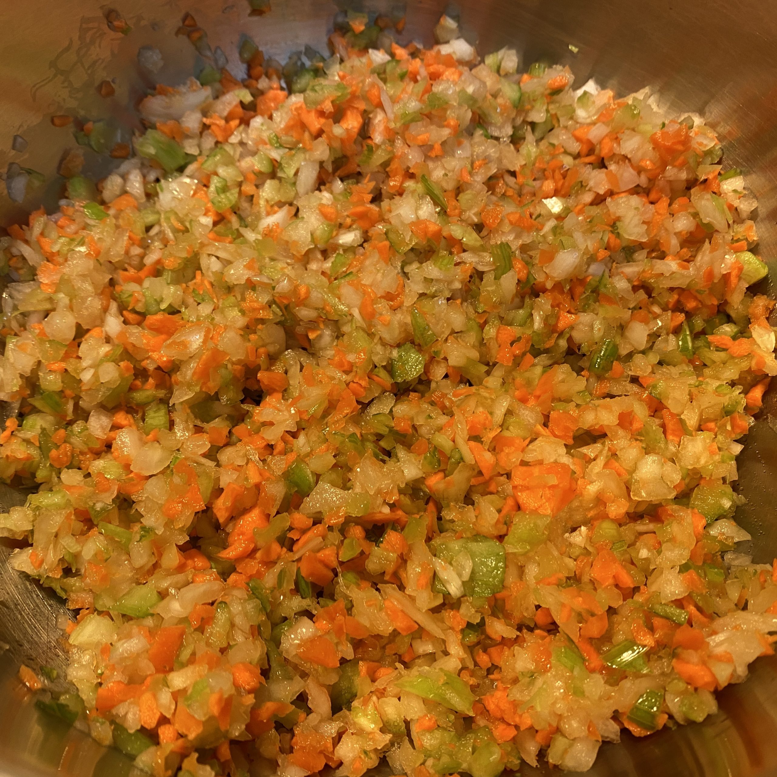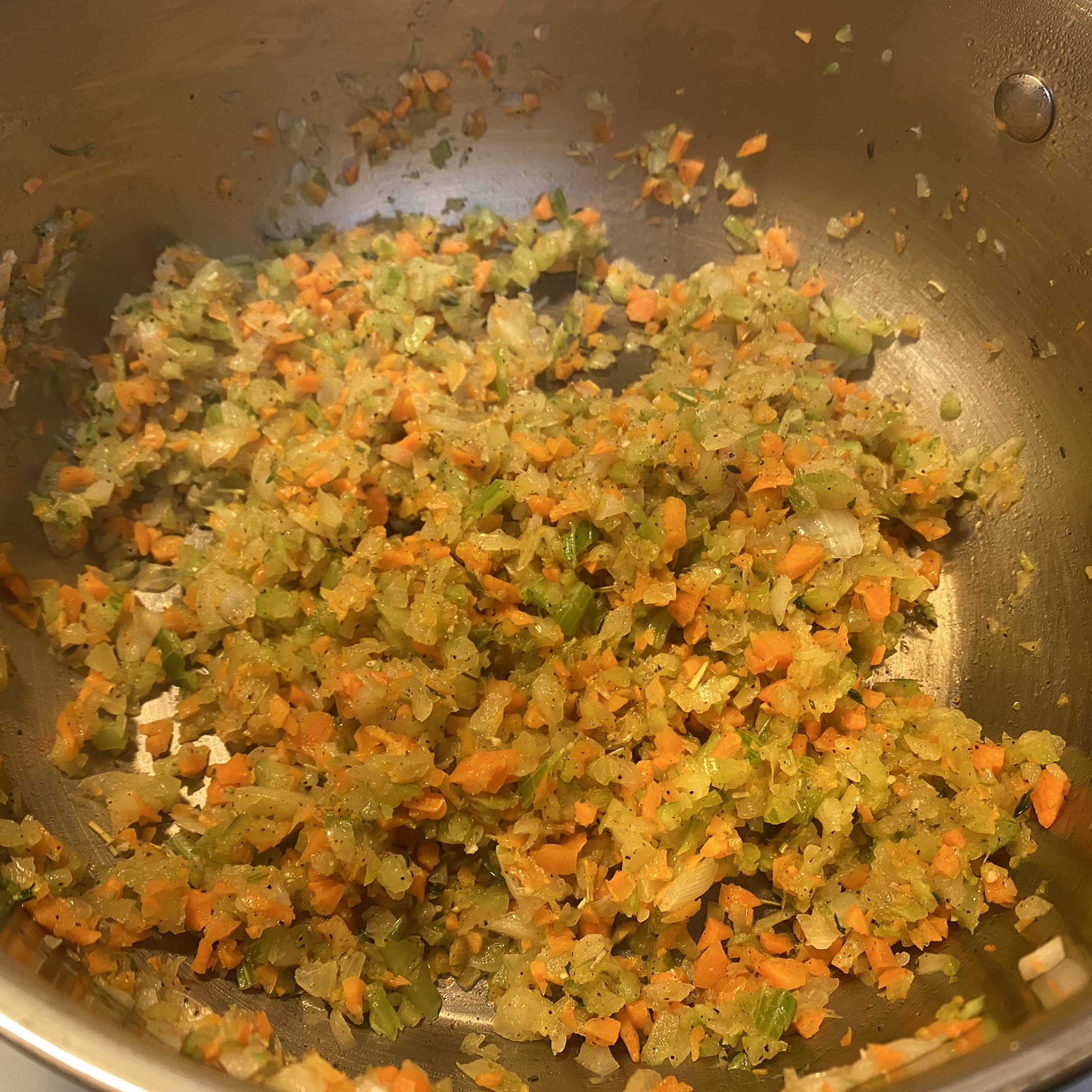 2. In a large pot over medium heat, add olive oil. Once hot, add the vegetables and sautee until soft and translucent, about 5-7 minutes.