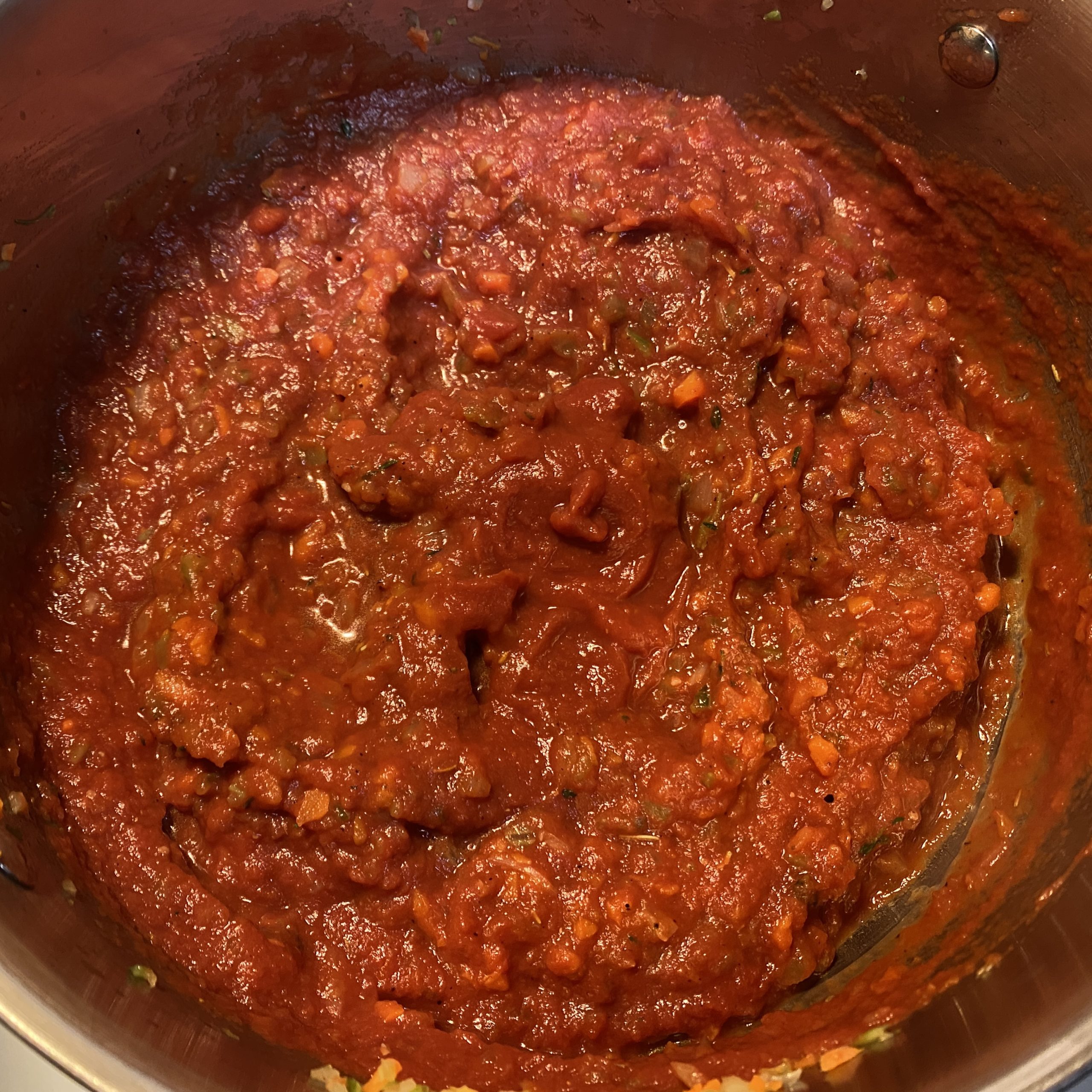 4. Add the can of crushed tomatoes and mix. Lower the heat and let cook for about 10 minutes, stirring occasionally.