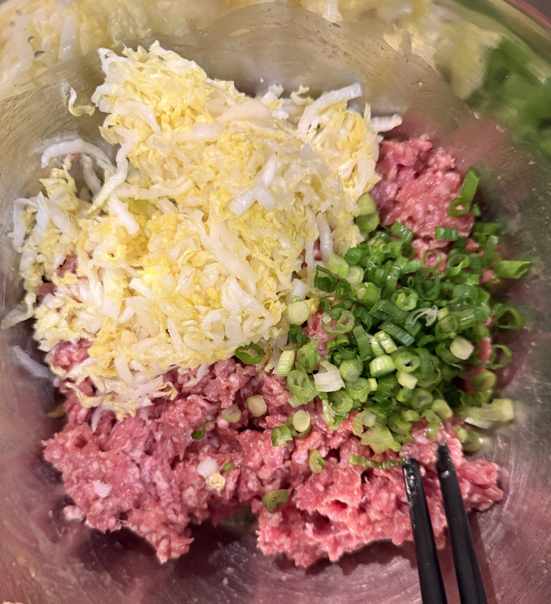 3. Squeeze out extra moisture from the cabbage and add to the pork. Add the scallions, salt and pepper and mix.