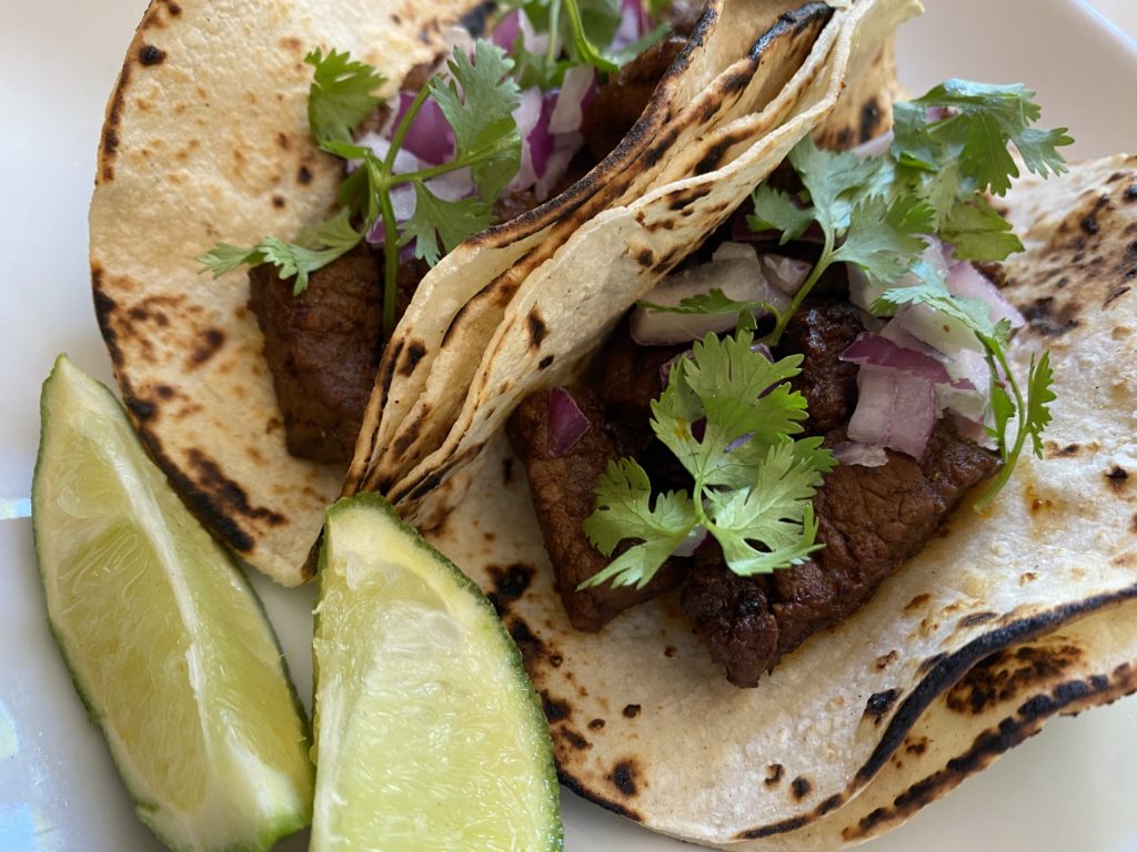 - Serve steak in tortillas, topped with onion, cilantro and lime.