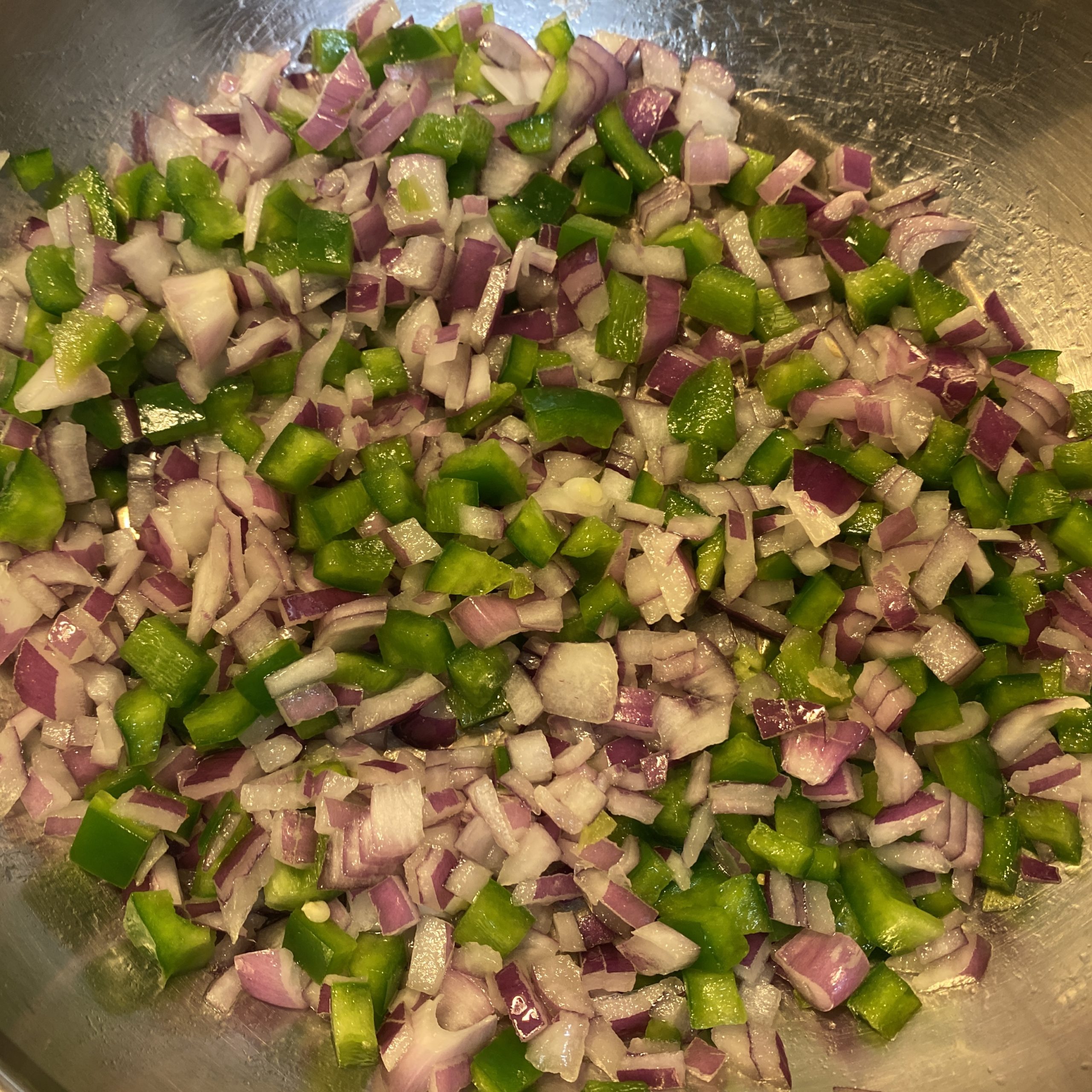 2. Once the oil is ready, add the bell peppers and onions and sauté until soft, about 5 minutes.