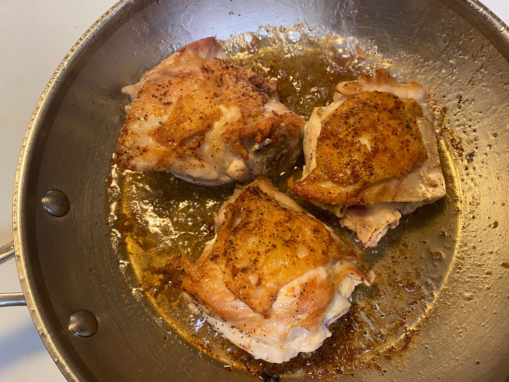 - Add oil to a medium pan. Once ready, add the chicken thighs skin down and cook about 80 percent through and until golden brown (it will be cooked through in the sauce later on), about 7 minutes per side.