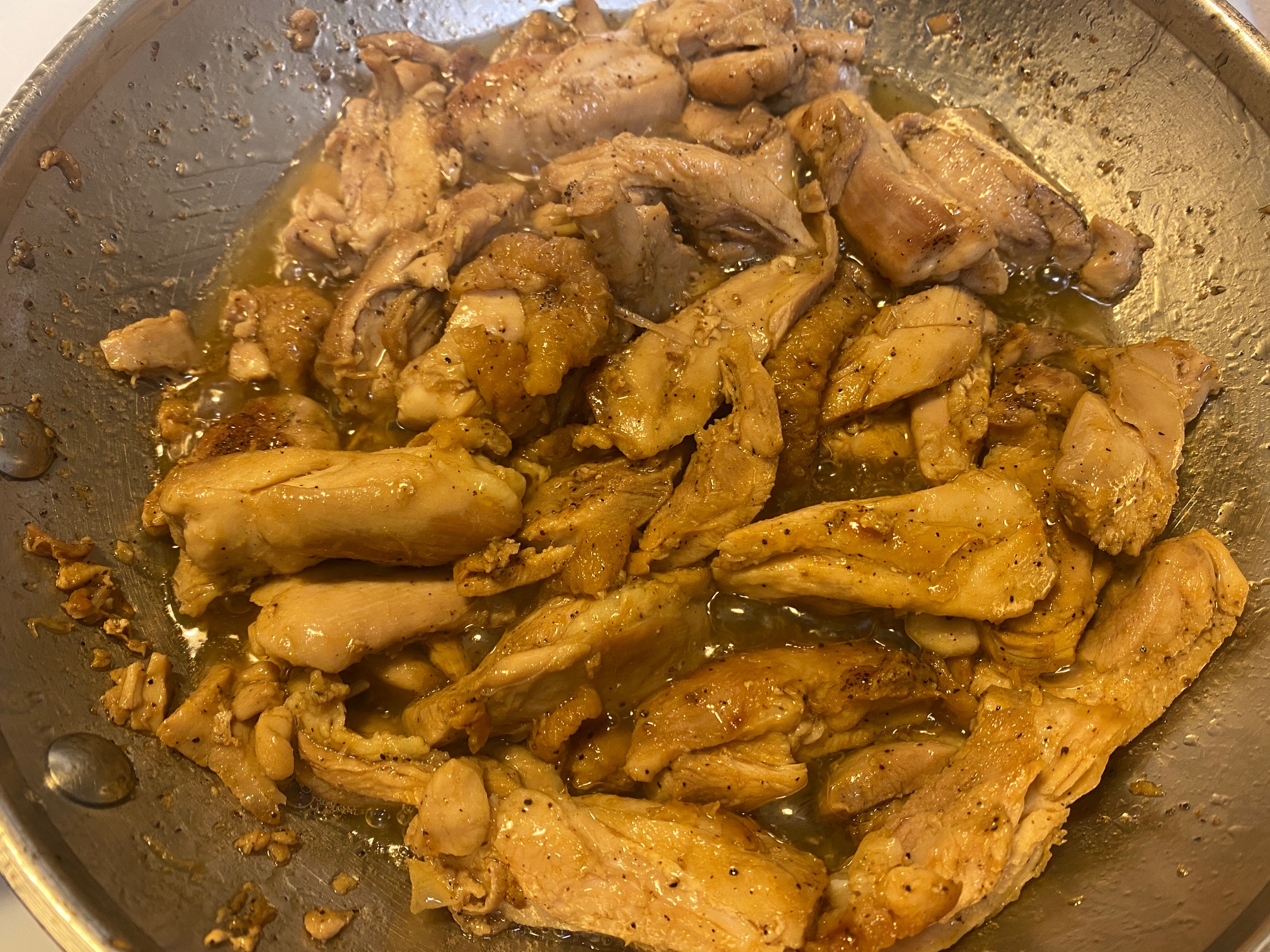 6. Cut the chicken thighs into 1 inch strips and add them back to the pan.