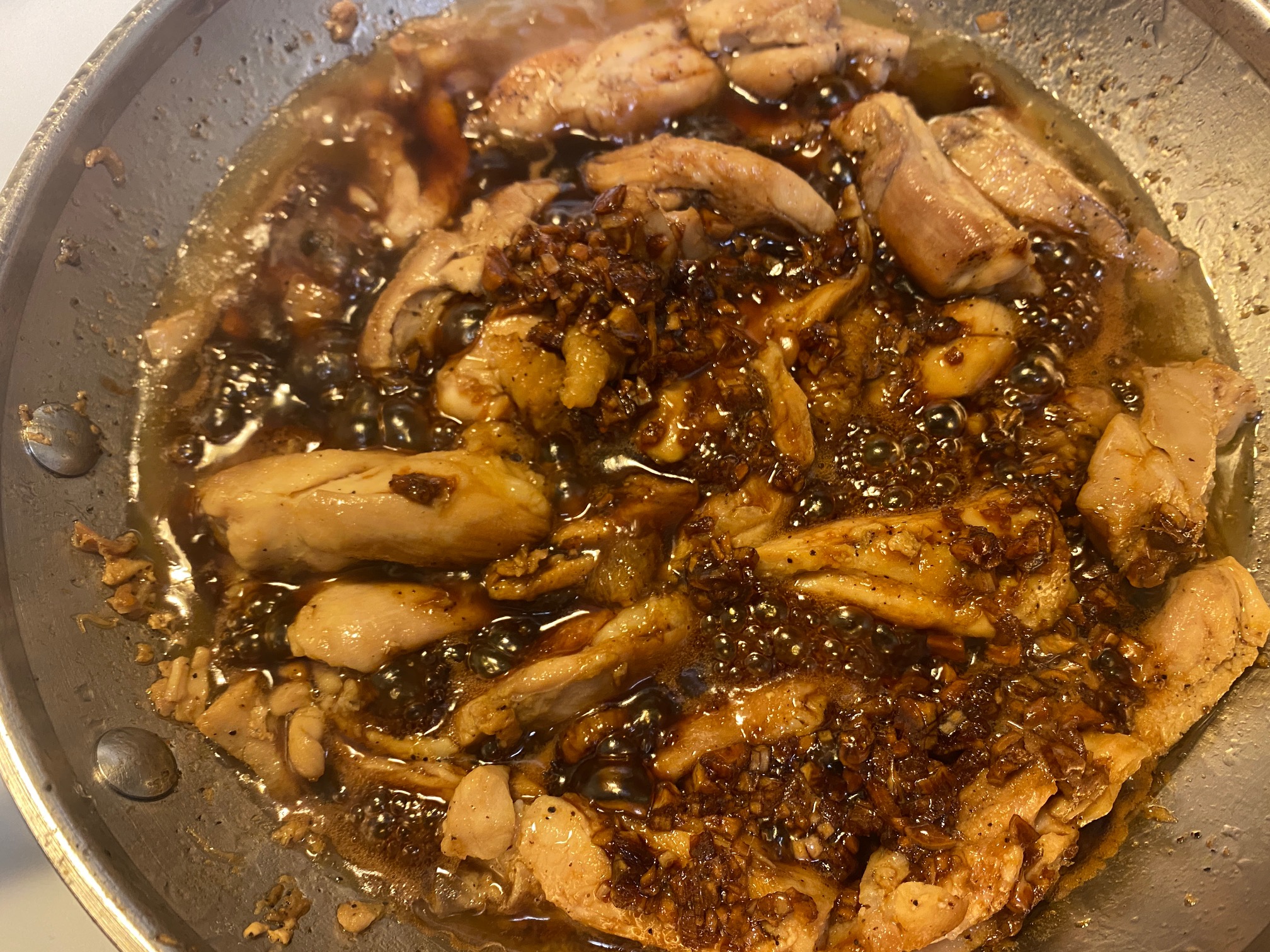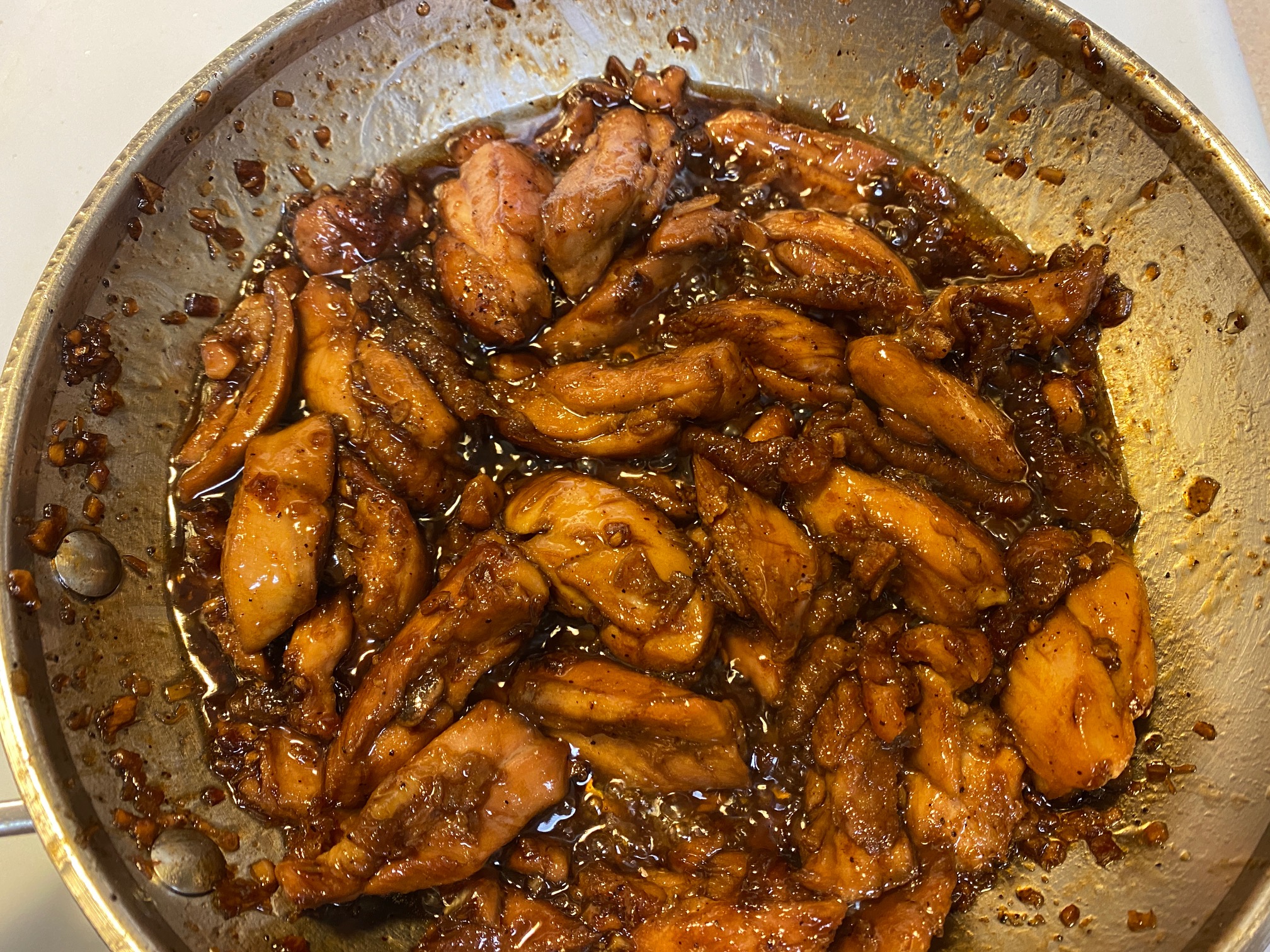 - Add the reduced sauce mixture and stir. Let cook until the sauce fully reduces and becomes sticky, about 10-12 minutes.