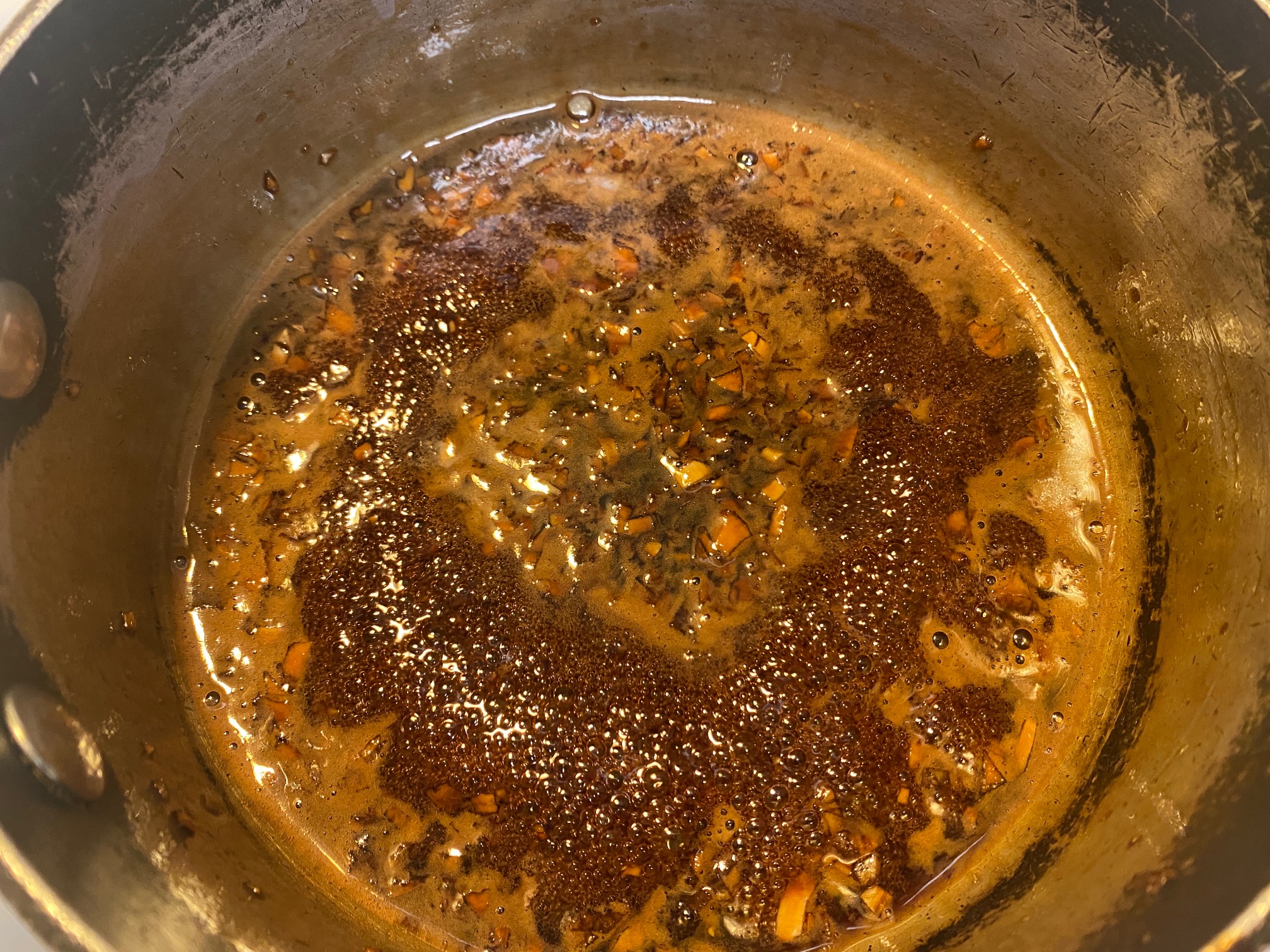 - Put a medium saucepan on the stove over low heat and add the mixture. Let simmer until the sauce reduces and comes to a light boil (about 10 minutes), stirring occasionally. Set aside.