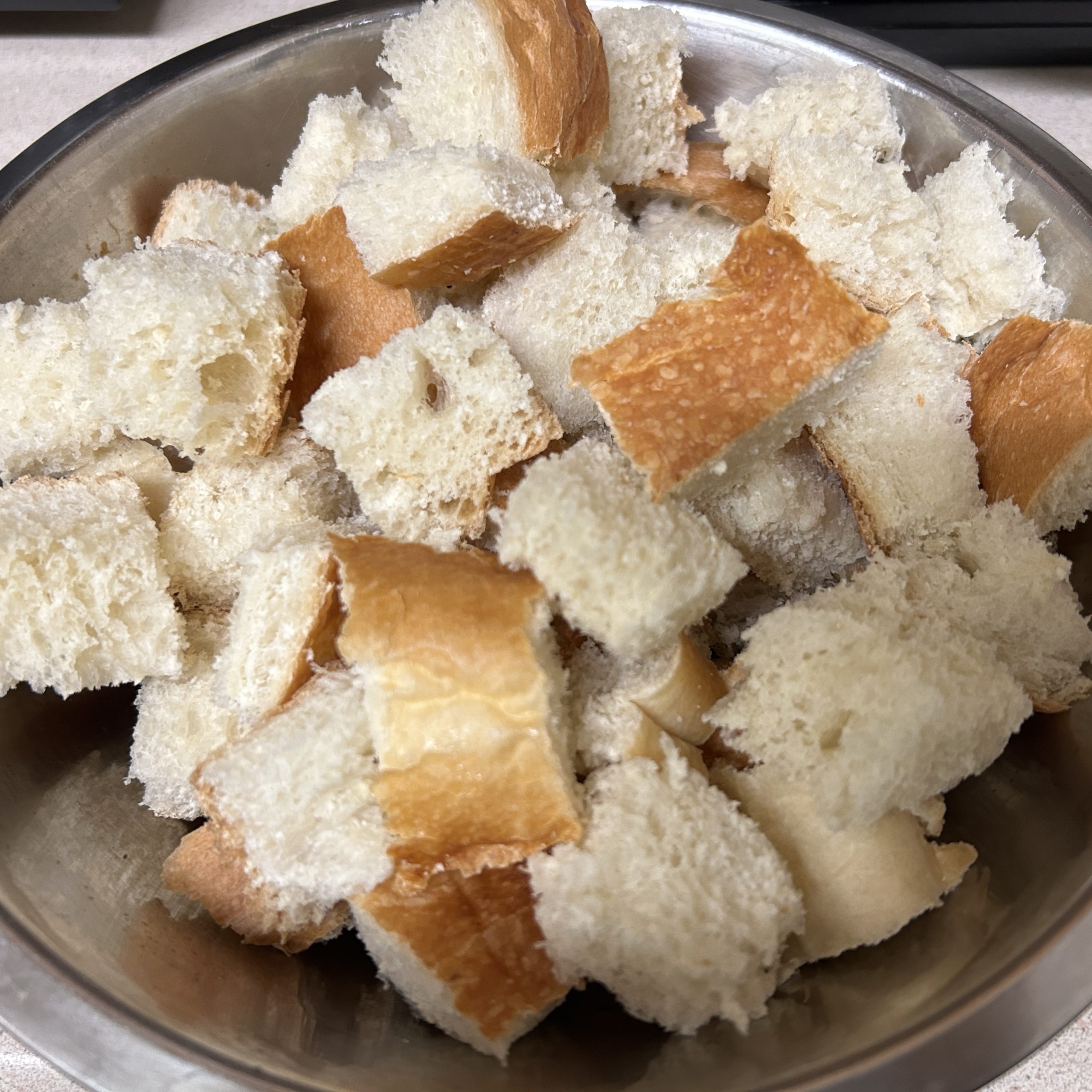 - Cut up the bread into bite sized pieces and coat drizzle generously with olive oil. (I used truffle infused olive oil for this step and it added a ton of flavor!)
