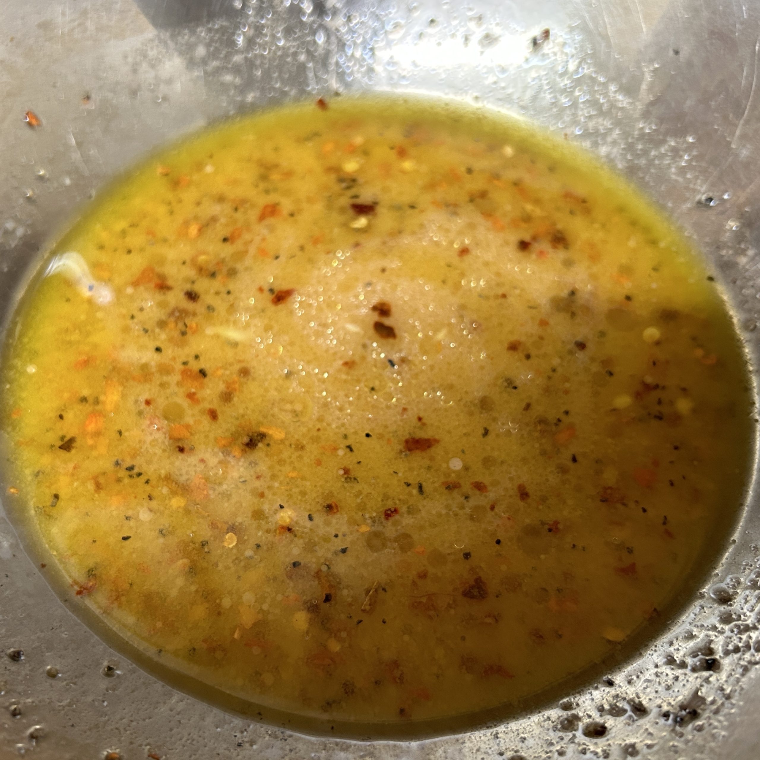 - Add the dijon, garlic, salt, pepper and red pepper flakes, if using, and whisk.
