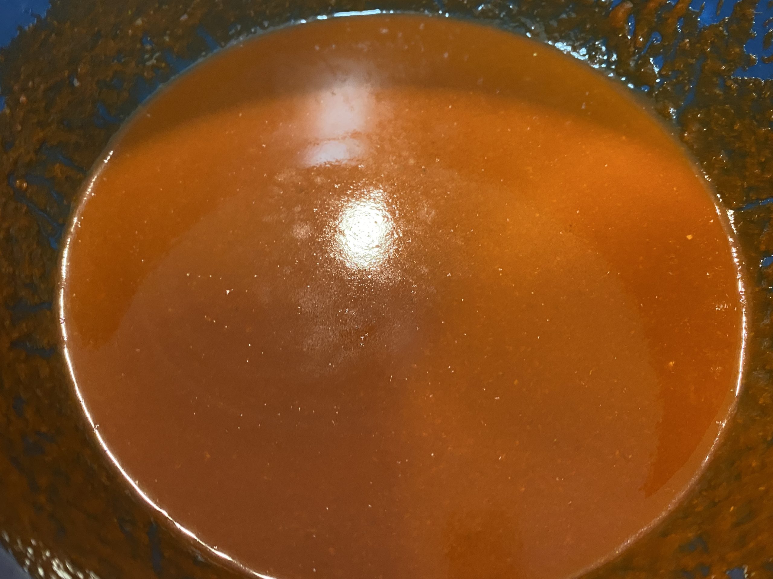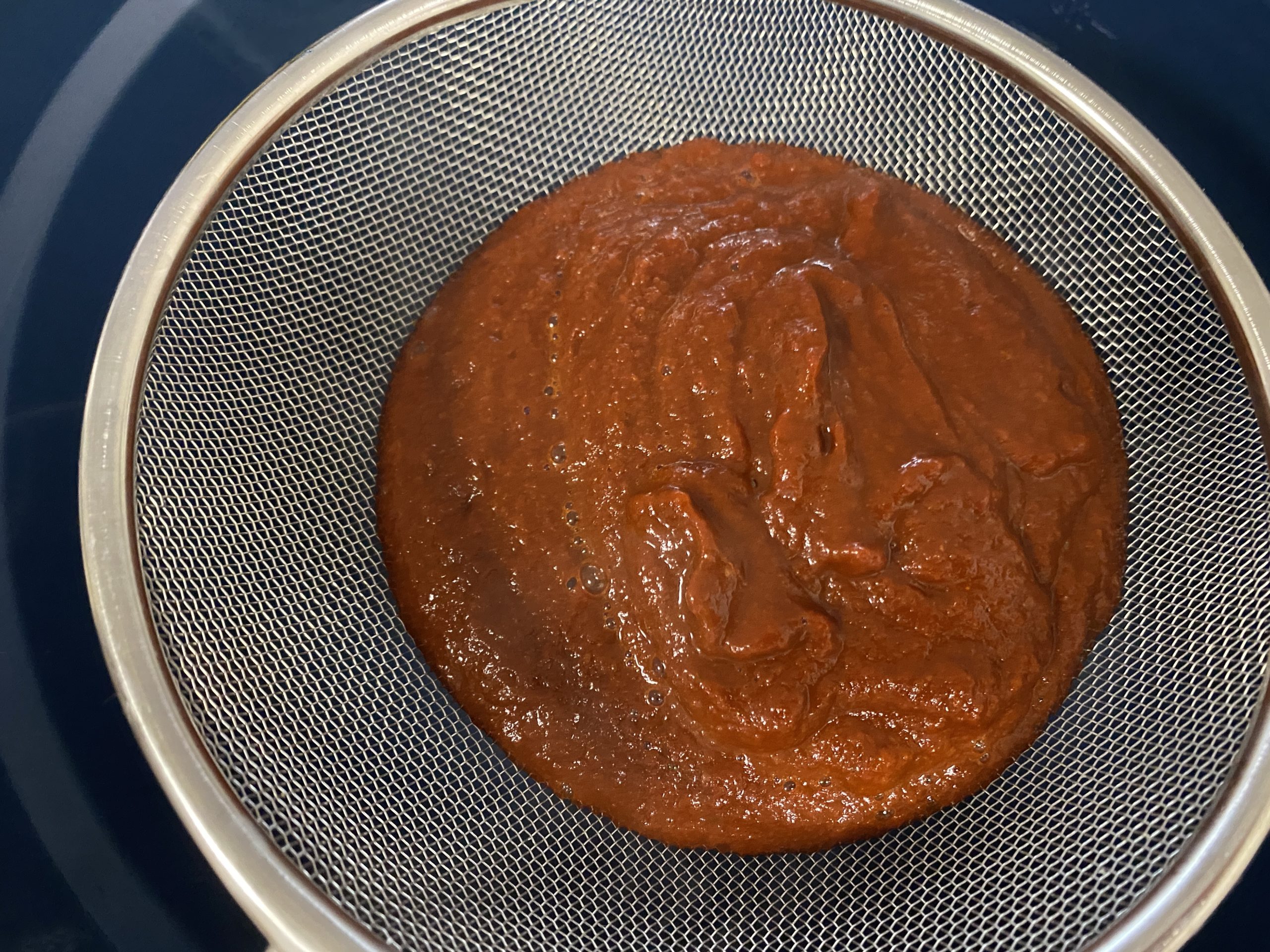 4. Using a strainer, strain sauce until no clumps are present. (tip: add hot water or chicken broth while straining to smooth sauce out)