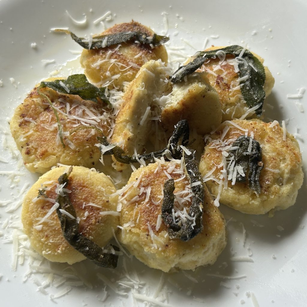 Gnudi literally translates to naked in Tuscan dialect. Ricotta gnudi is essentially a “naked” ravioli coated in a light layer of semolina flour.