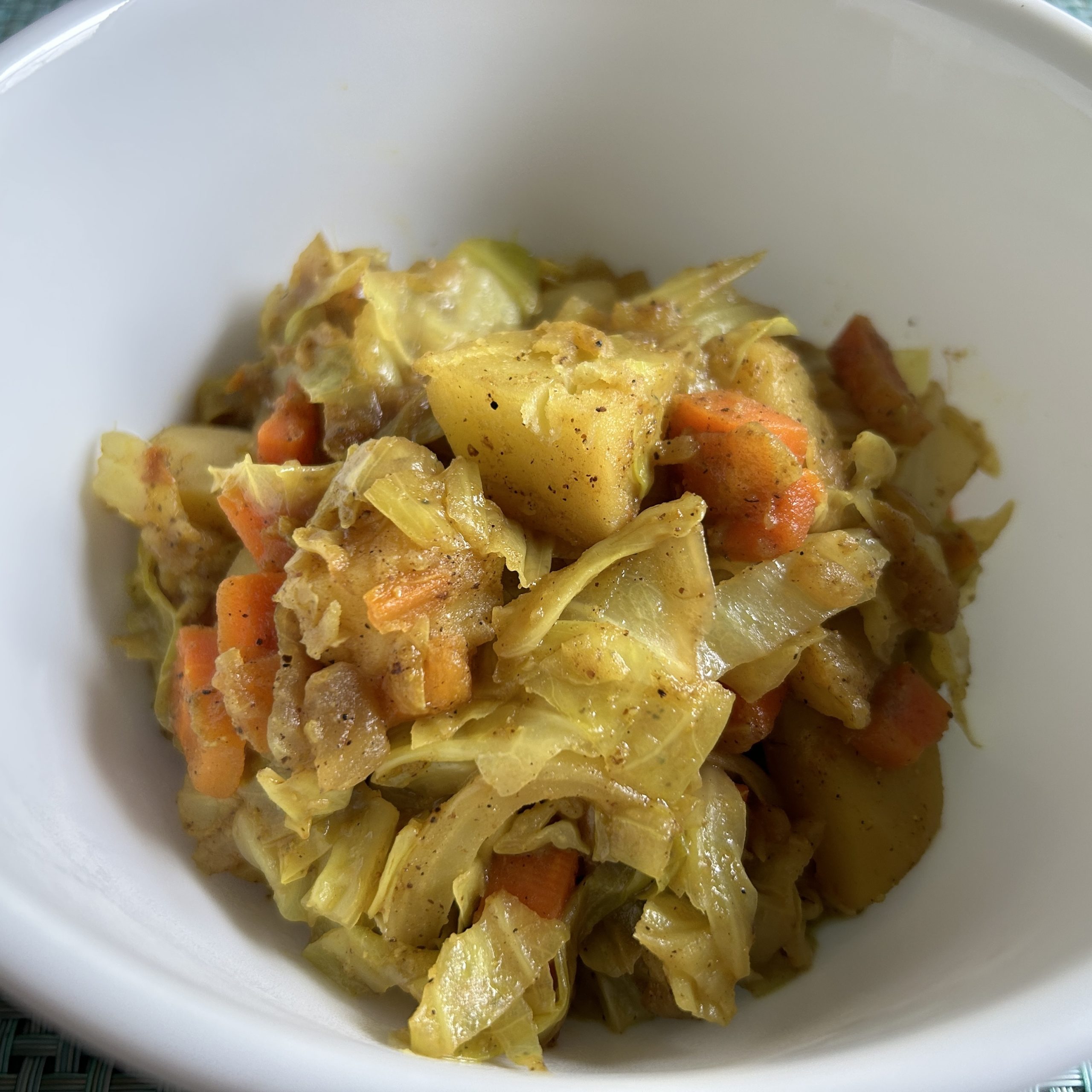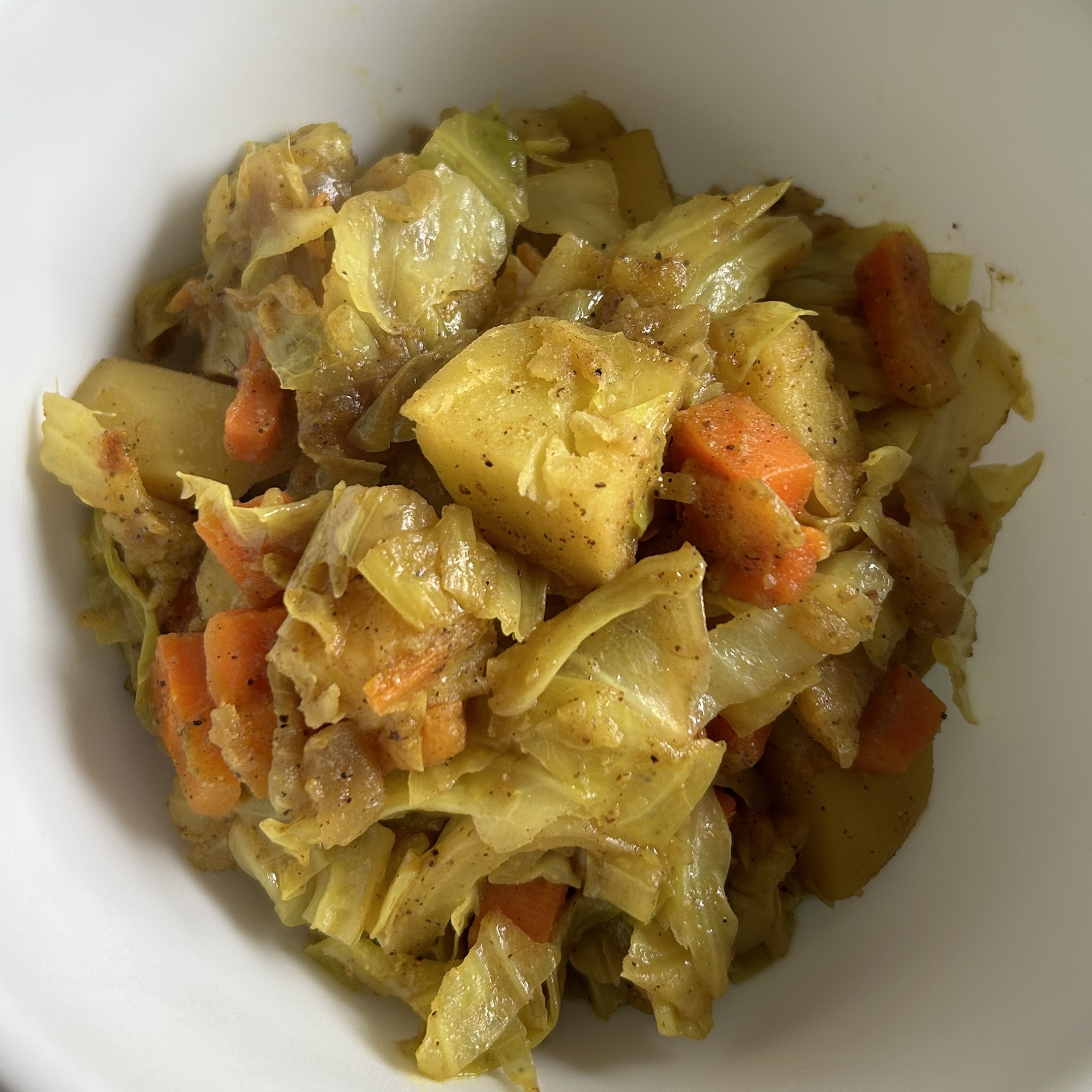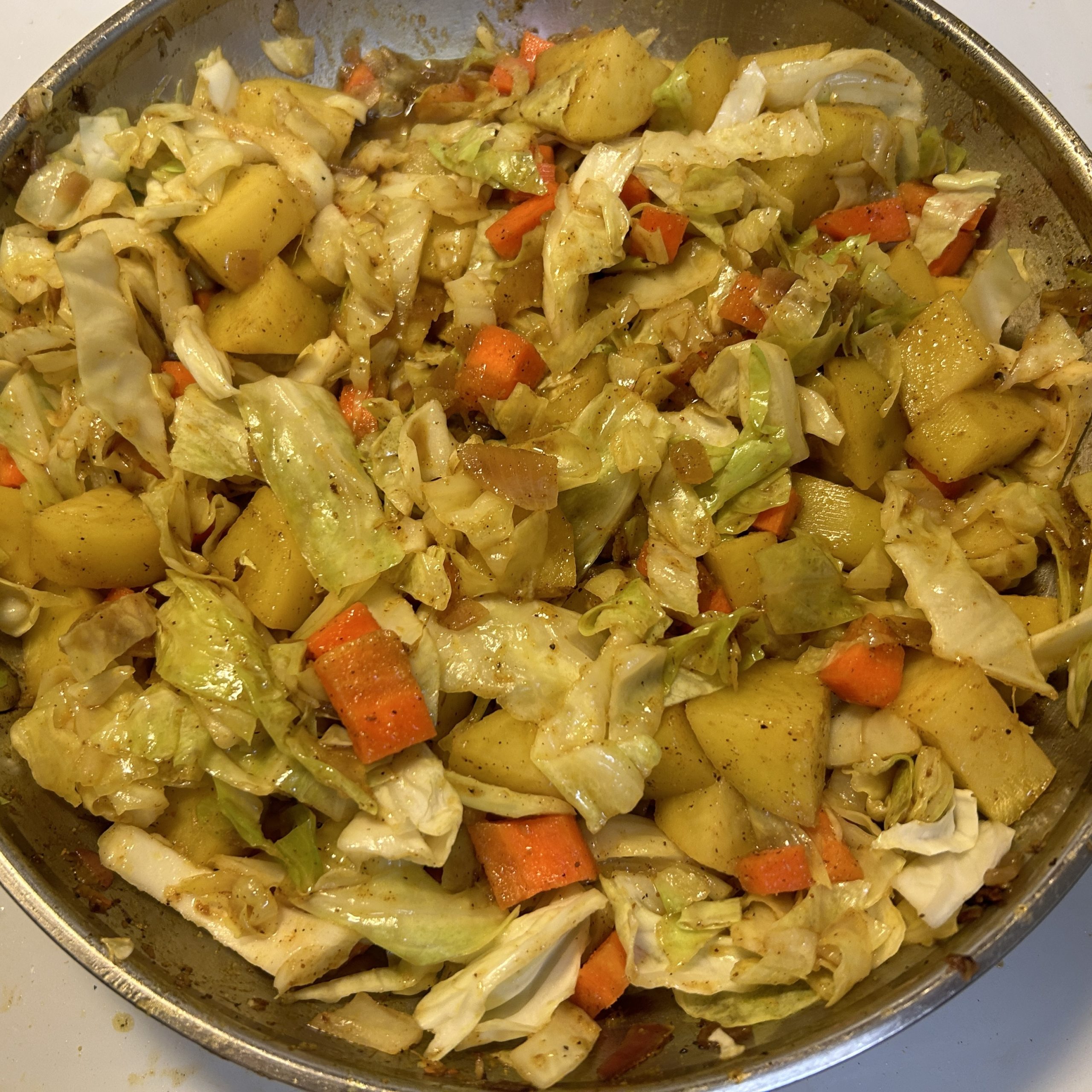 This dish includes cabbage, carrots and potatoes and is typically seasoned with ginger, garlic, turmeric and cumin and simmered on low until the vegetables are tender.