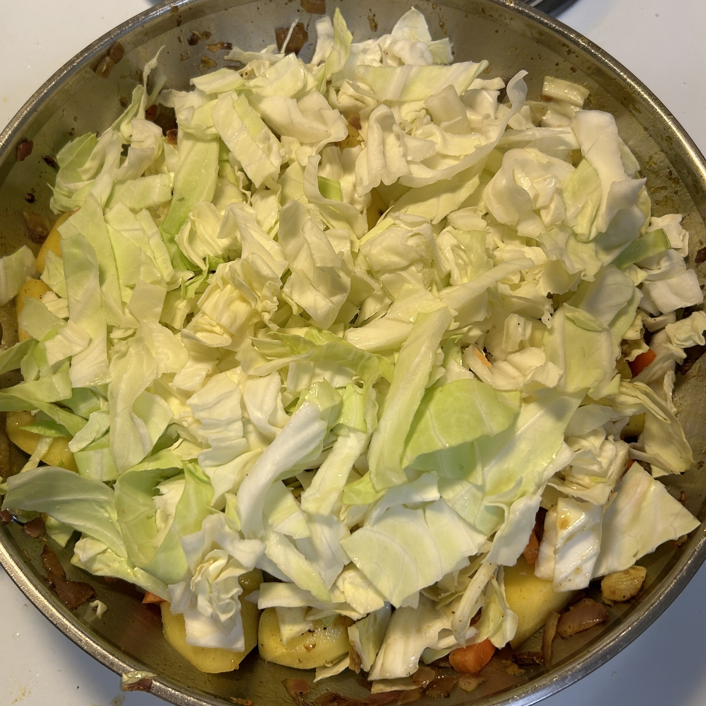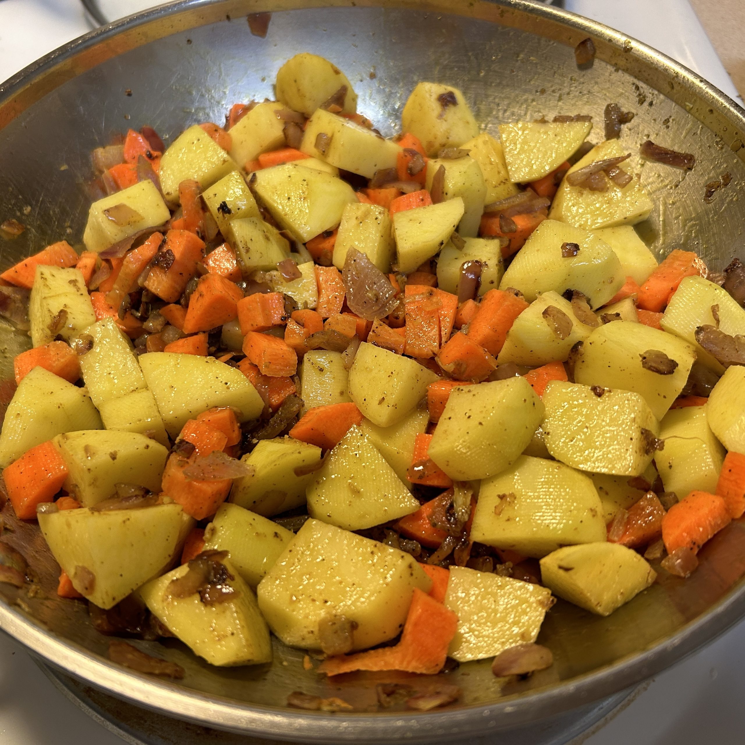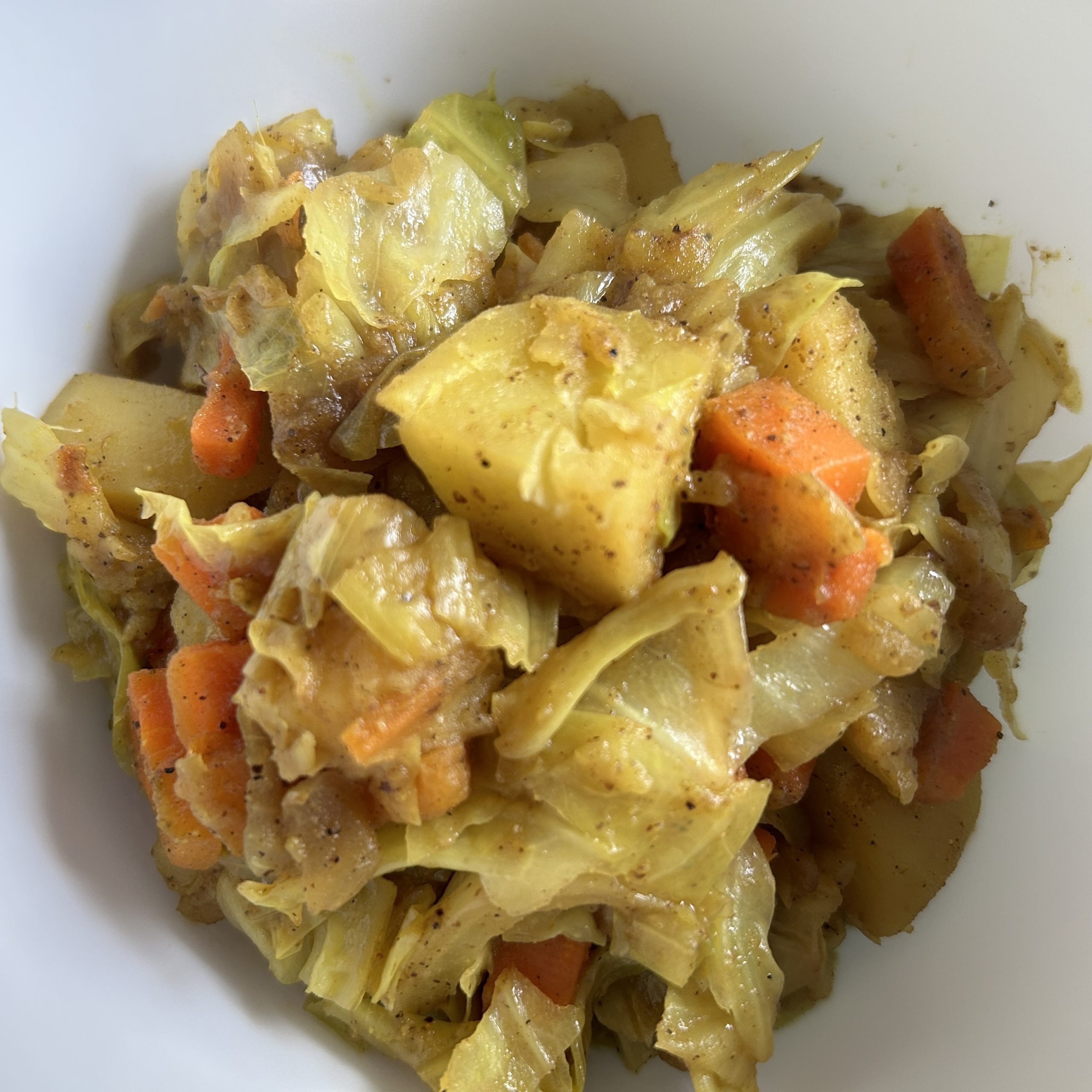 This dish includes cabbage, carrots and potatoes and is typically seasoned with ginger, garlic, turmeric and cumin and simmered on low until the vegetables are tender.