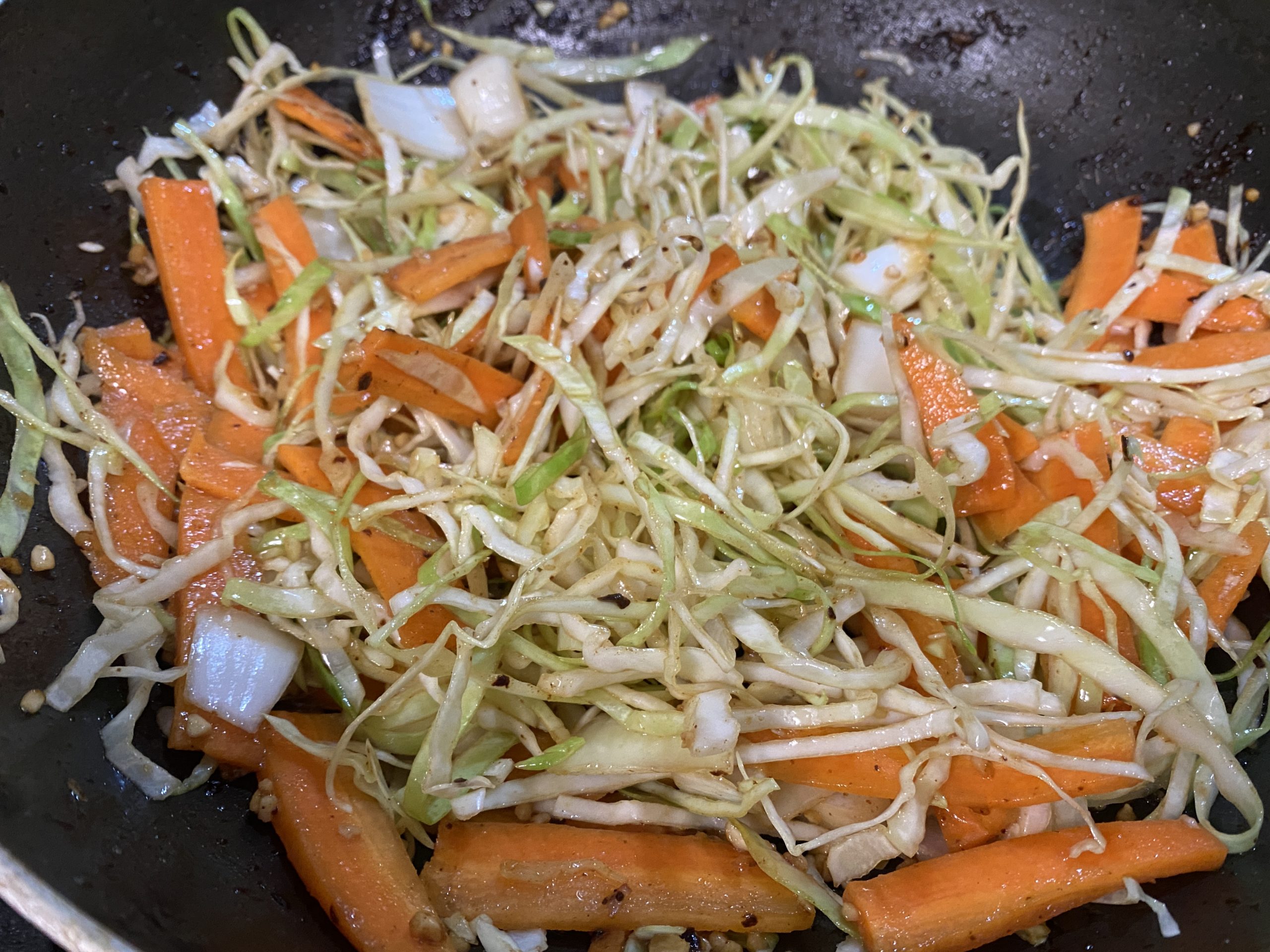 - Add another couple tablespoons of oil to the wok or pan, and add the garlic. After 10 seconds, add the cabbage and carrots. Stir-fry on high heat for a minute and add the wine in a circle around the perimeter.