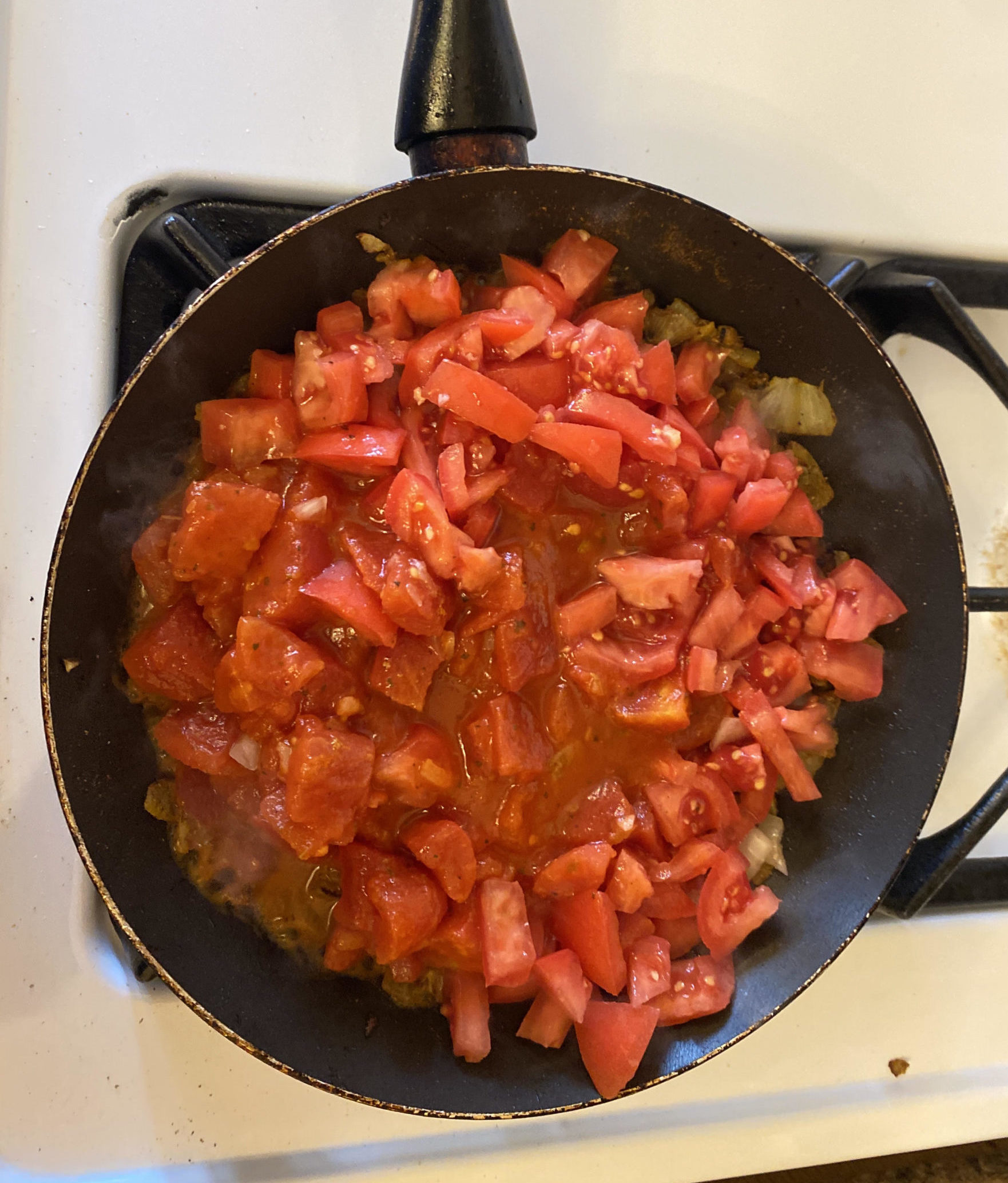 - Add the tomatoes and their juices. If using whole tomatoes, use the back of a wooden spoon to break the tomatoes apart (you can leave some chunks of tomato for texture).