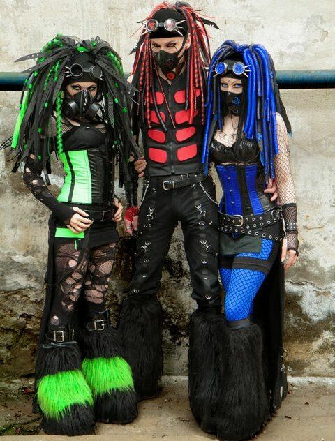 - Cybergoth/Raver/Clubwear: This style is a newer approach to the cyberpunk aesthetic and inspired by the Matrix trilogy. These cyberpunks wear neon color clothing and hairstyles, bodysuits, goggles, skirts, leggings, latex, platform boots and fishnet stockings.