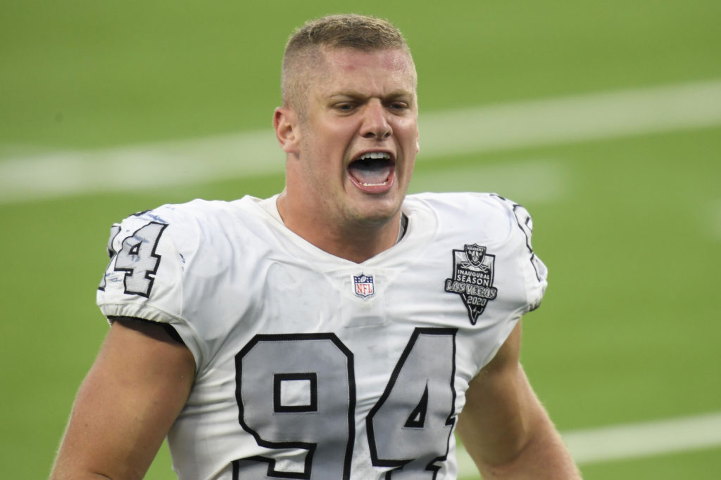 CHARLOTTE, NORTH CAROLINA – SEPTEMBER 13: (L-R) Johnathan Hankins #90, Carl Nassib #94 and Maurice Hurst #73 of the Las Vegas Raiders reacts after a quarterback sack against the Carolina Panthers during their game at Bank of America Stadium on September 13, 2020 in Charlotte, North Carolina. Las Vegas won 34-30. (Photo by Grant Halverson/Getty Images)