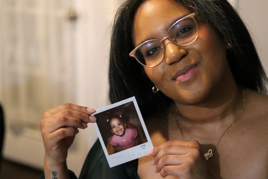 JERSEY CITY, NJ 3/20/24 POLAROID: Naomi Betancourt poses with a childhood photo taken of her in West New York. Photo by Chelsea Pujols
