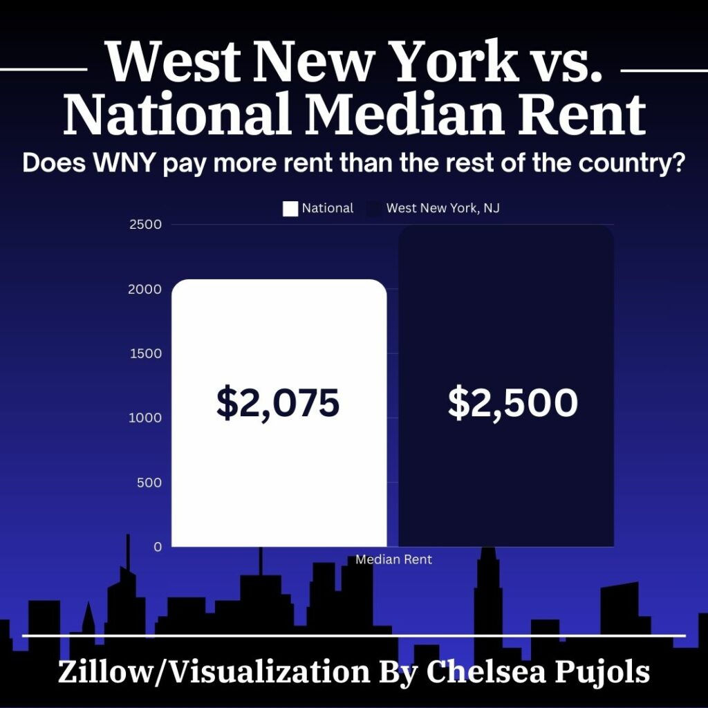 Zillow reports that the current median rent in West New York is $2,450, which is $200 more than in 2022. This is also about 23% higher than the median rent for the nation.