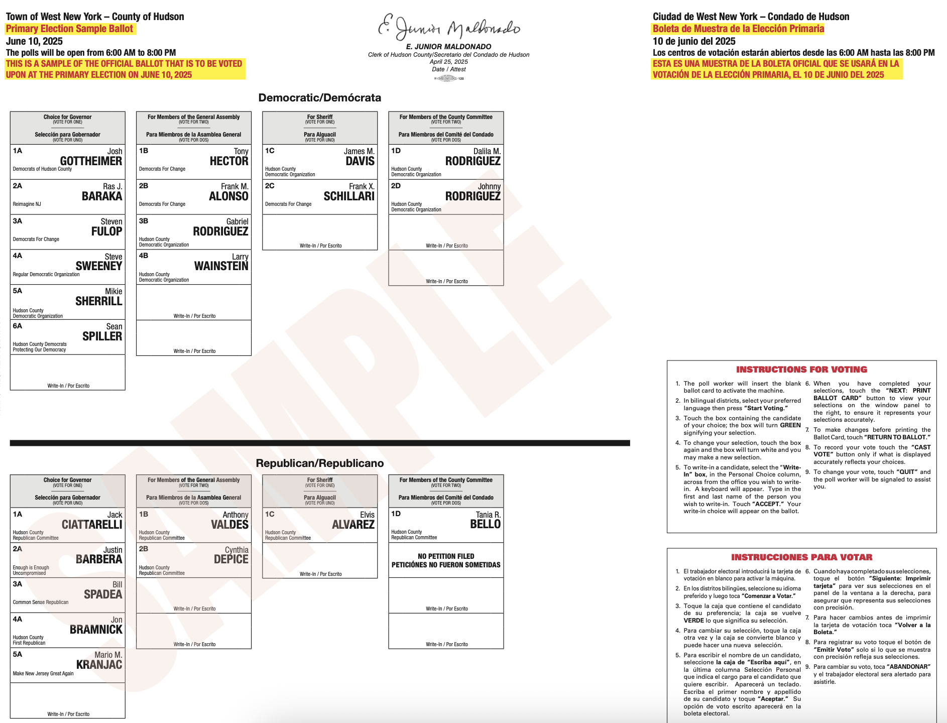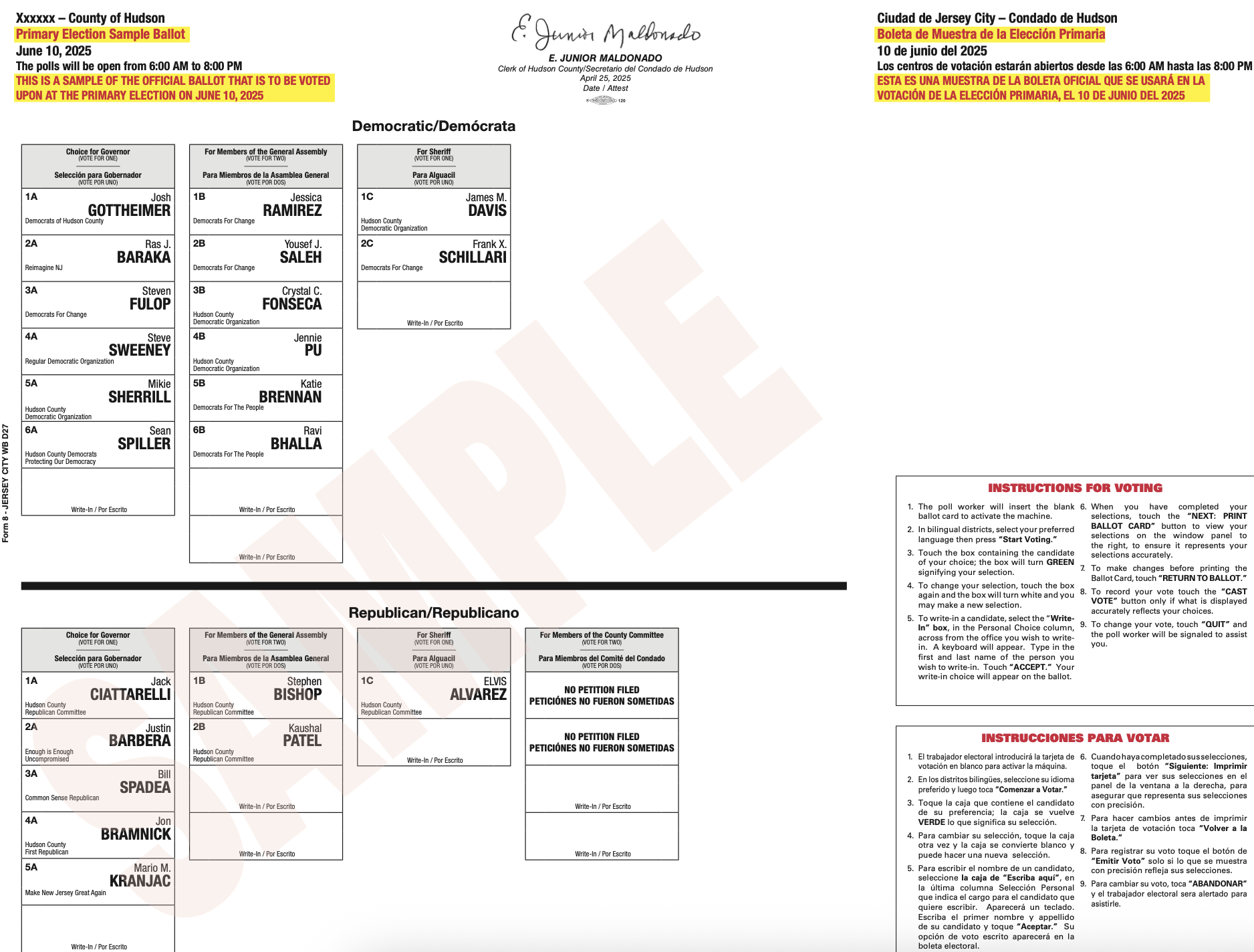 Depending on a voter’s location, their ballot may vary. However, generally, voters will find these names running for the following positions. To view your sample ballot, look for your town/district here: https://www.hudsoncountyclerk.org/2025-june-10th-primary-election-sample-ballots/.