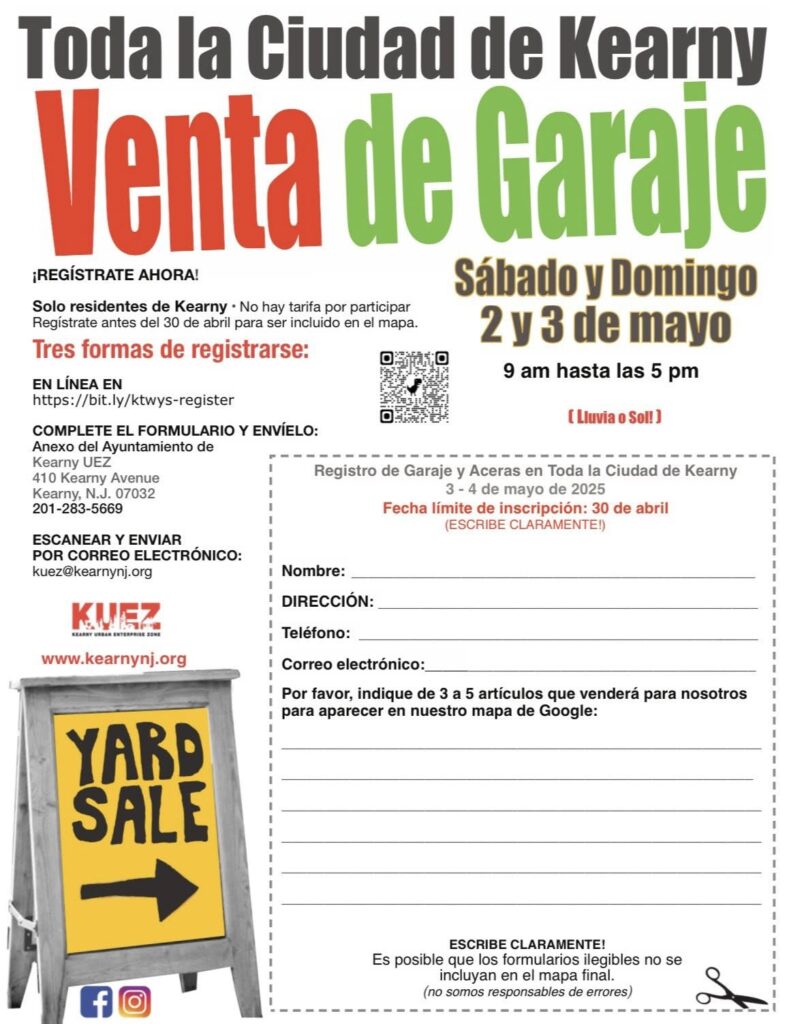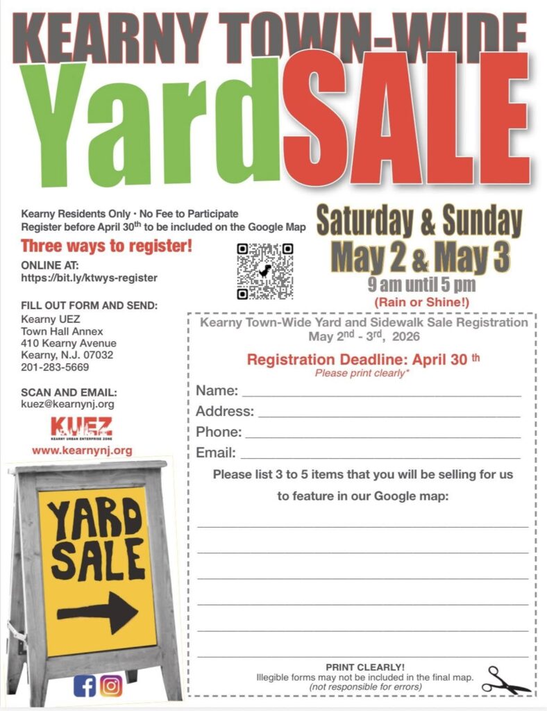 The Kearny Town-Wide Yard Sale is on May 2 and May 3 from 9 a.m. to 5 p.m. rain or shine!
