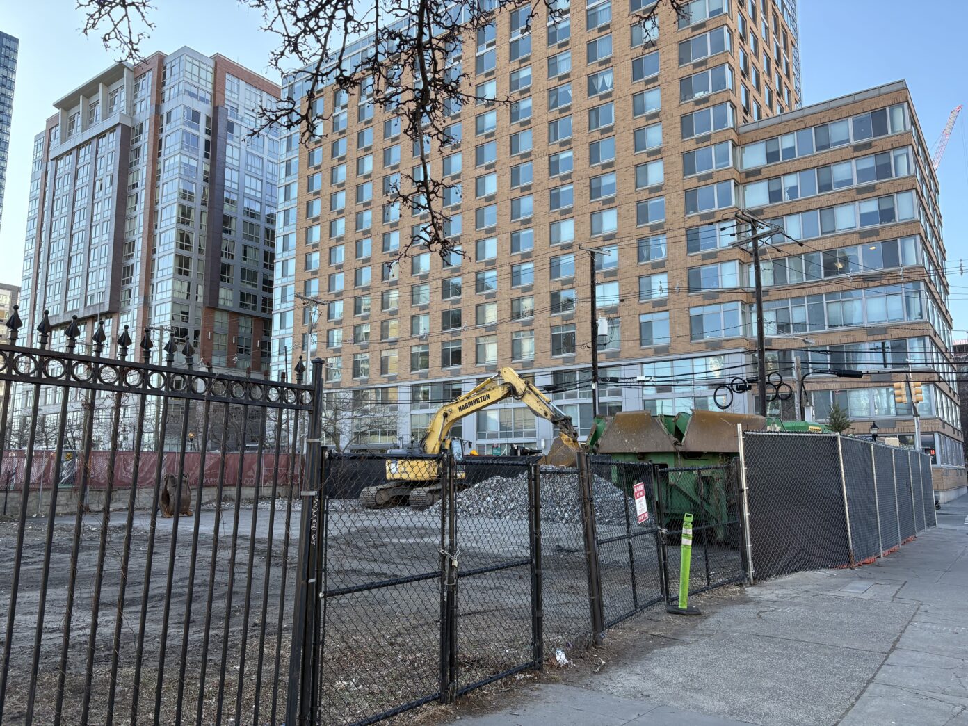 The Golden Cicada building at 195 Grand Street has been fully torn down, with construction equipment already present at the site. (Chris Fry / Jersey Digs).