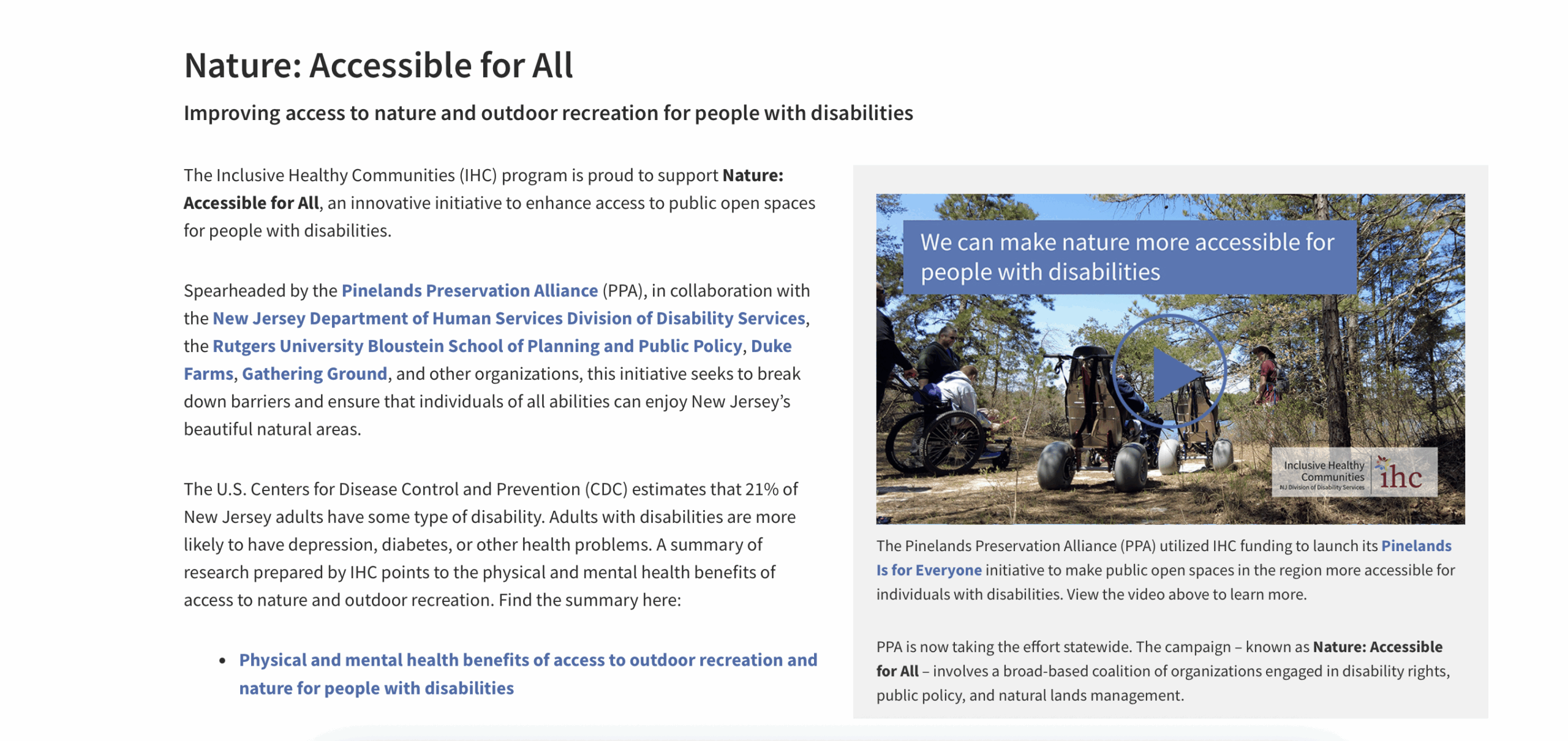 Martin pointed to the Pinelands Preservation Alliance, which started the Access to Nature initiative. It began in South Jersey and has expanded across the state, which has allowed access to nature.