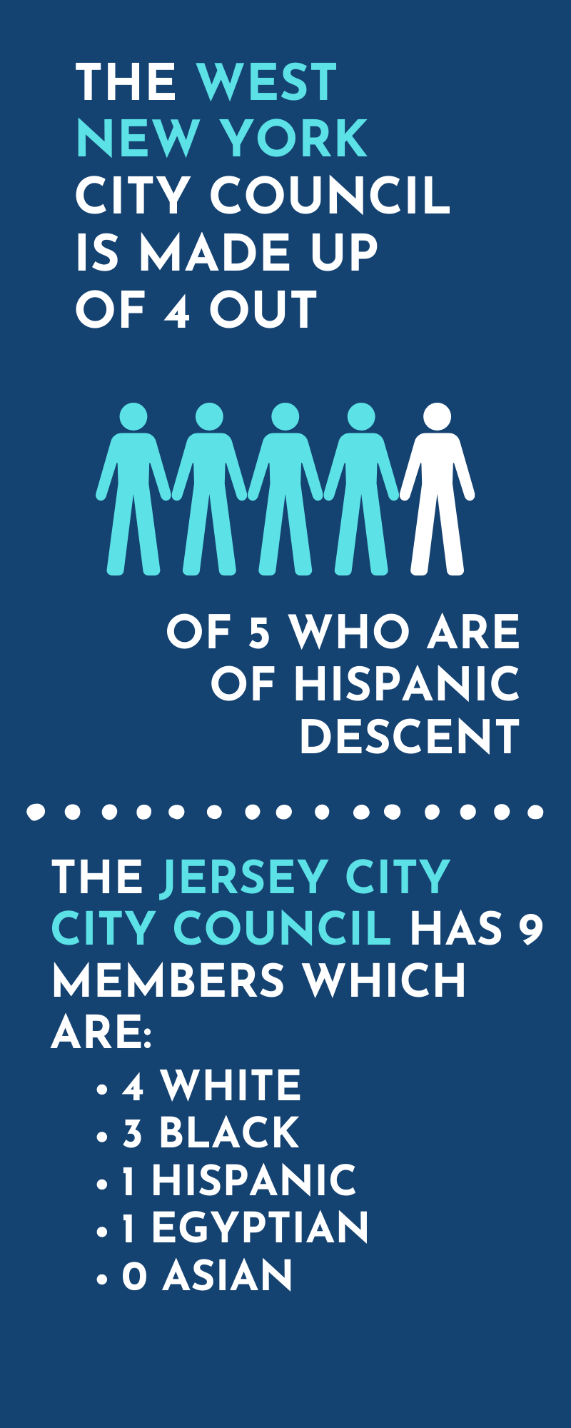 Jersey City is the most diverse city in the country. According to the U.S. Census, the Black population is 22.4 percent, Asian is 25.4, Hispanic is 27.5. and White is 22.4 percent.