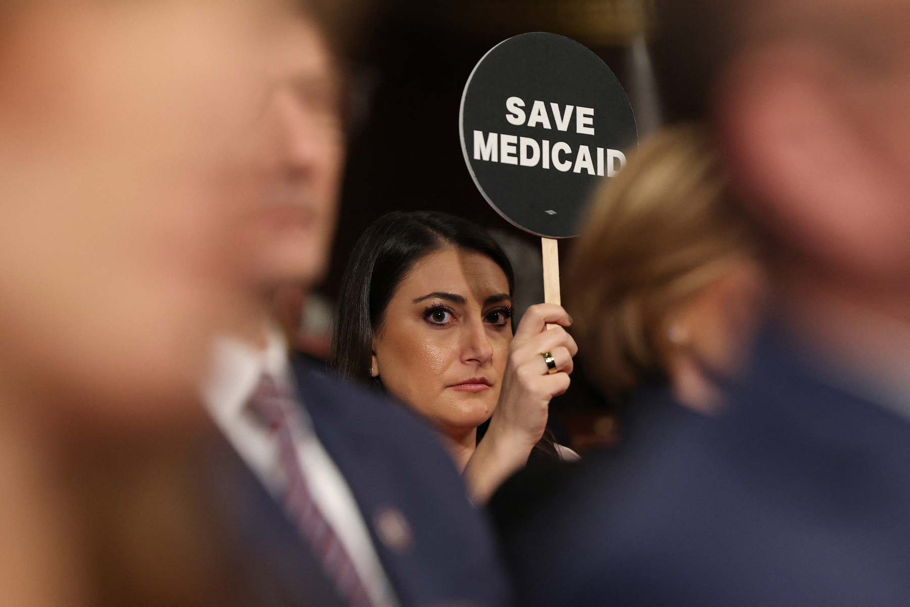 US Representative Sara Jacobs (D-CA) holds a “Save Medicaid” protest sign as President Donald Trump addresses a joint session of Congress on March 4. (WIN MCNAMEE/AFP/Getty Images)
