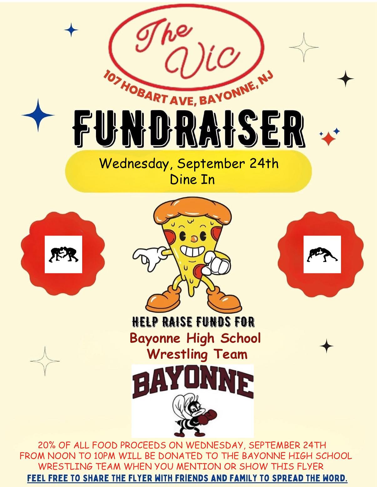 On Wednesday, Sept. 24 there will be a dine-in at the Vic Tavern located at 107 Hobart Avenue in Bayonne to support the Bayonne High School wrestling team.