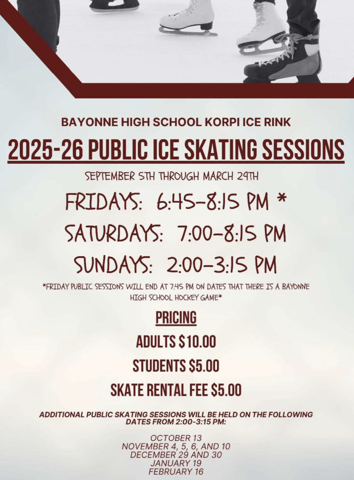 Public skate sessions at the Bayonne High School Korpi Ice Rink, located at 38 W 28th Street, are officially underway on Fridays and weekends until March 29, 2026.