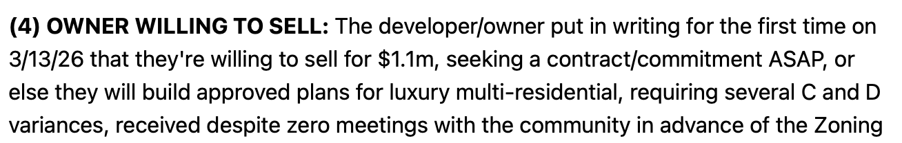 According to an email to Slice of Culture, the owner of 128 Glenwood Avenue—the site of the former community garden—put in writing on March 13, 2026 that they’re willing to sell for $1.1 million and is seeking a “contract/commitment ASAP, or else they will build approved plans for luxury multi-residential.”