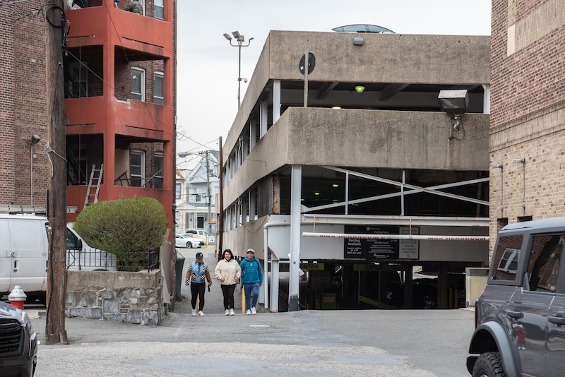 People walk in an alley next to a parking garage on Magnolia Avenue which connects to an alley next to Loew’s Jersey Theatre in Jersey City on Wednesday, March 20, 2024. (Reena Rose Sibayan / The Jersey Journal)