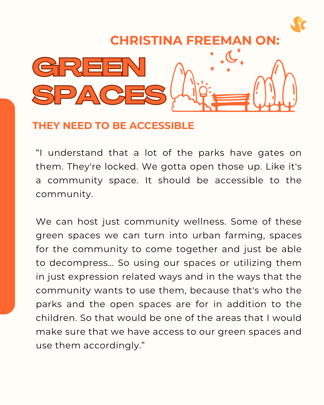 When asked about what makes her stand out compared to the other candidates, Freeman responded, “I’m from the people…Chances are something that you’ve experienced is something that I either have experienced or am currently experiencing.”