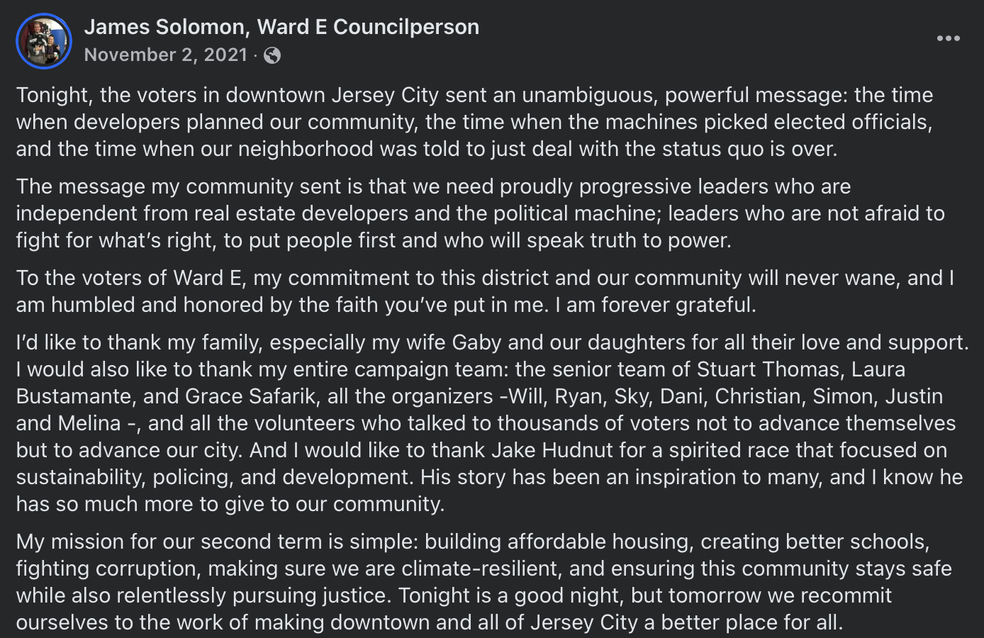 He will give back to Jersey City.