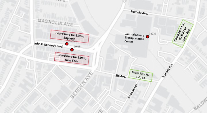 Lane assignments for all bus lines at Journal Square are subject to change due to scheduled ongoing construction at Journal Square Transportation Center.